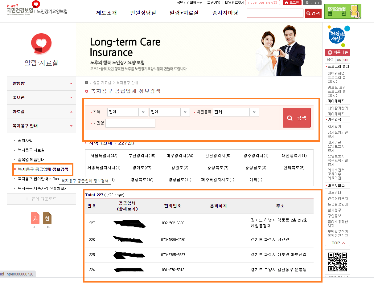 다시 국민건강보험공단 홈페이지로 가셔서 "복지용구 공급업체 정보검색"을 누르시고