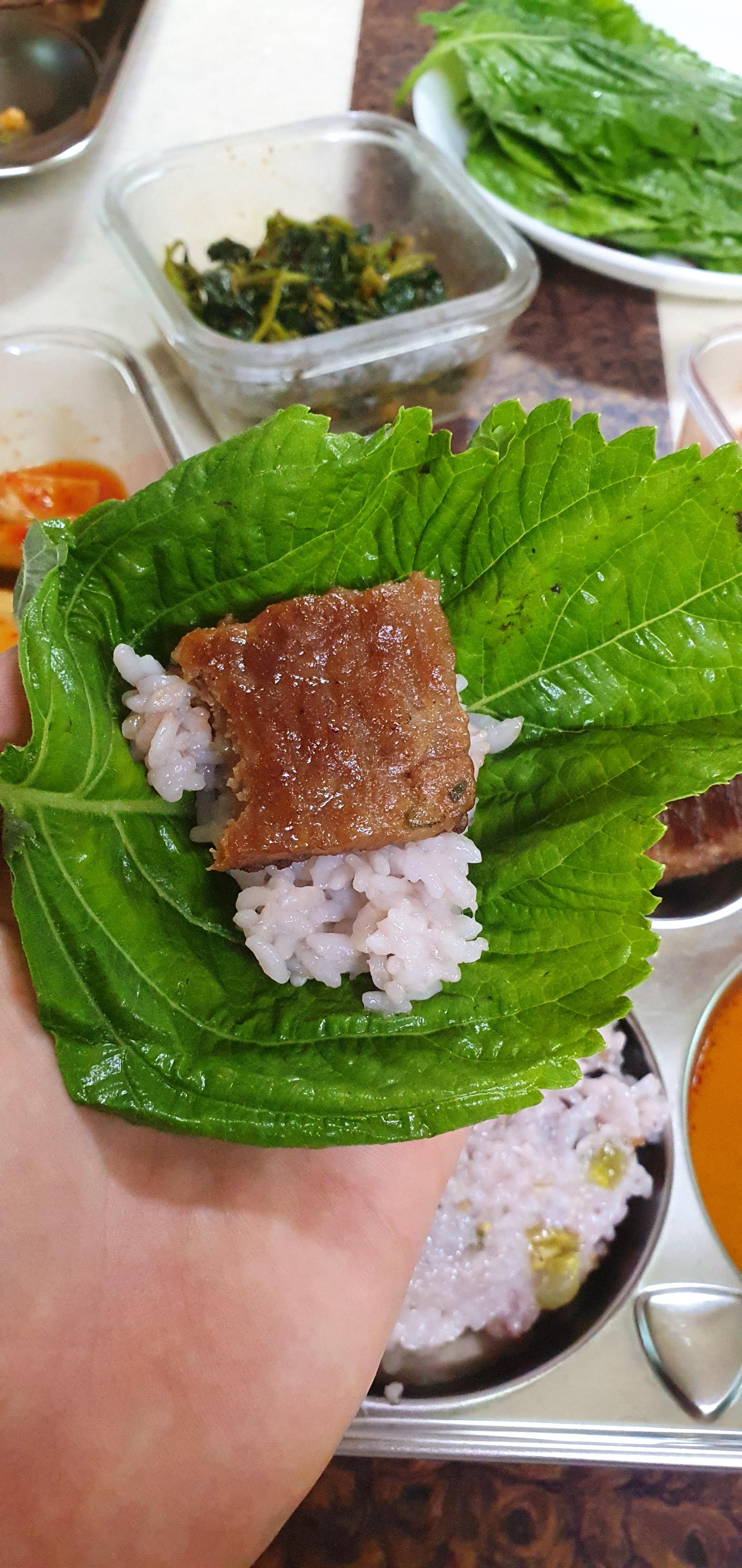 밥이랑 깻잎이랑 한쌈 싸서 냠냠 먹고
