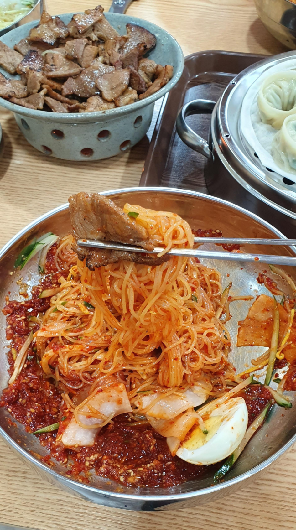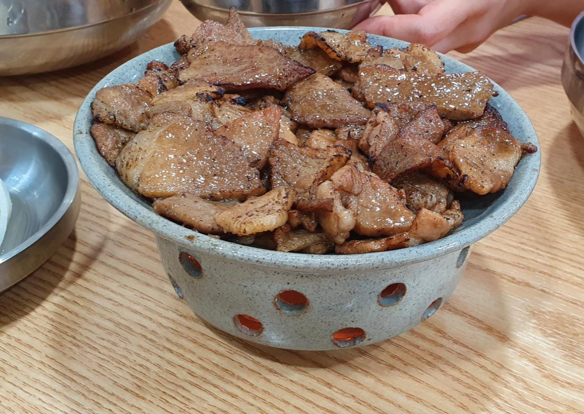 고기의 양이 적당하고, 연탄불로 궜기 대문에, 불맛이 나는 고기를 먹을수 잇는 대전 밀면!