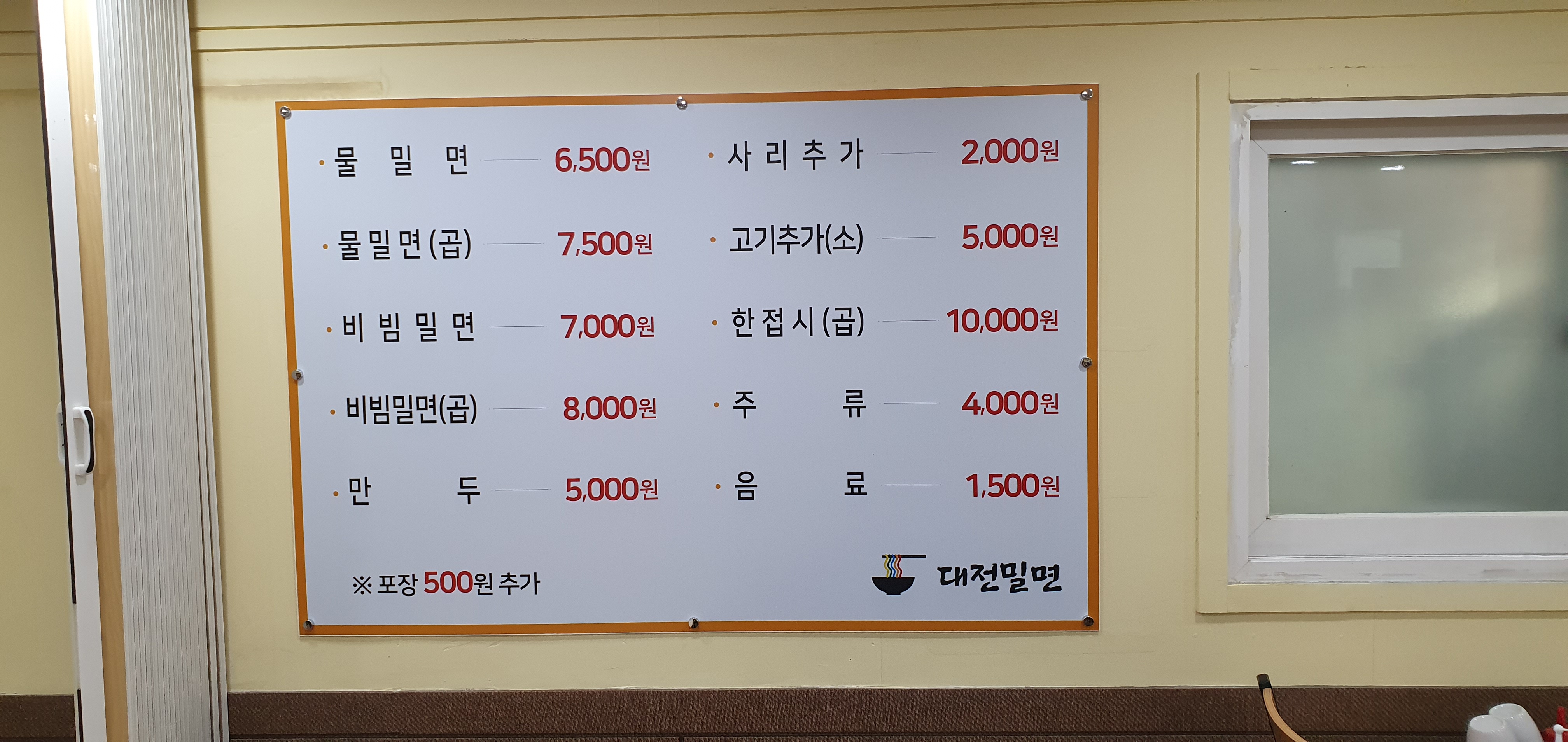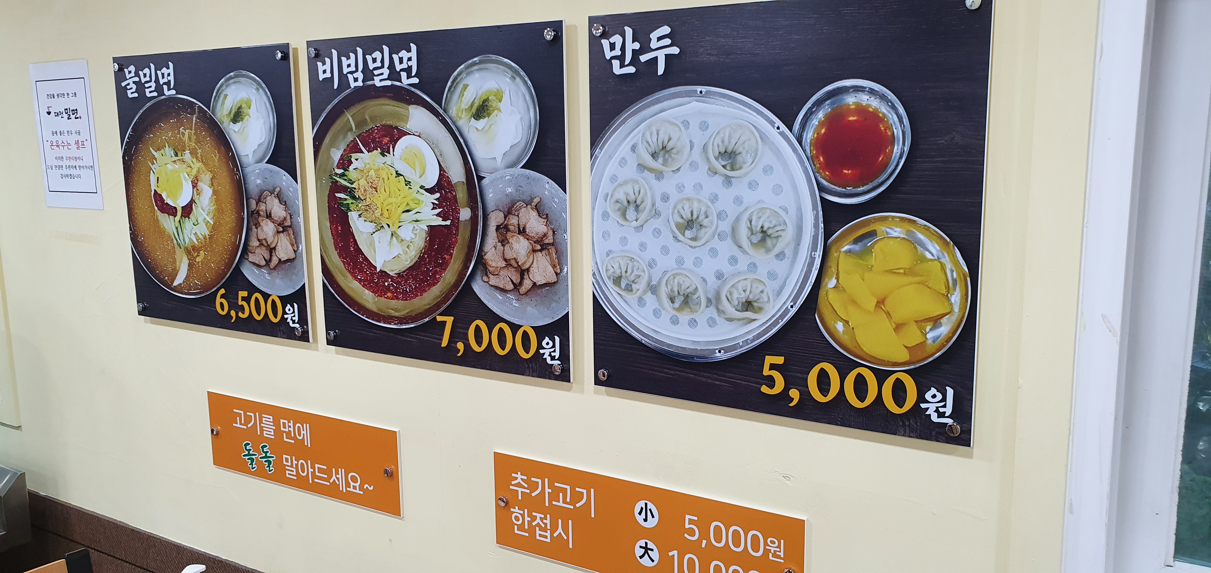 물밀면은 6500원 + 비빔밀면은 7000원 + 고기 추가 5000원 + 만두 5000원 이정도만 시키면 배터지게 대전 밀면을 맛볼수 있습니다.