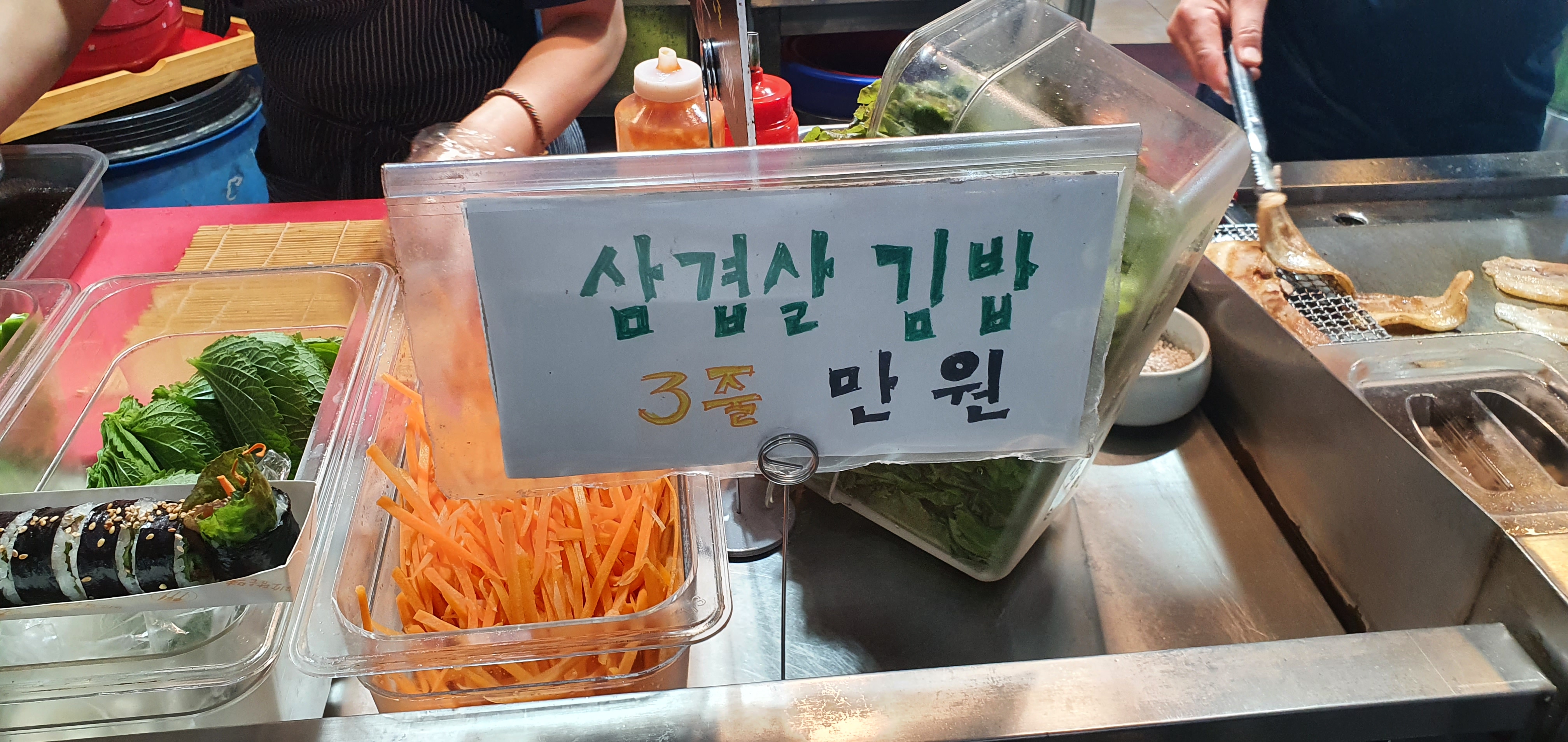 삼겹살김밥이랑 차돌박이 김밥 2종류가 있는데.. 삼겹살김밥을 3줄에 1만원에 판매하더군요.