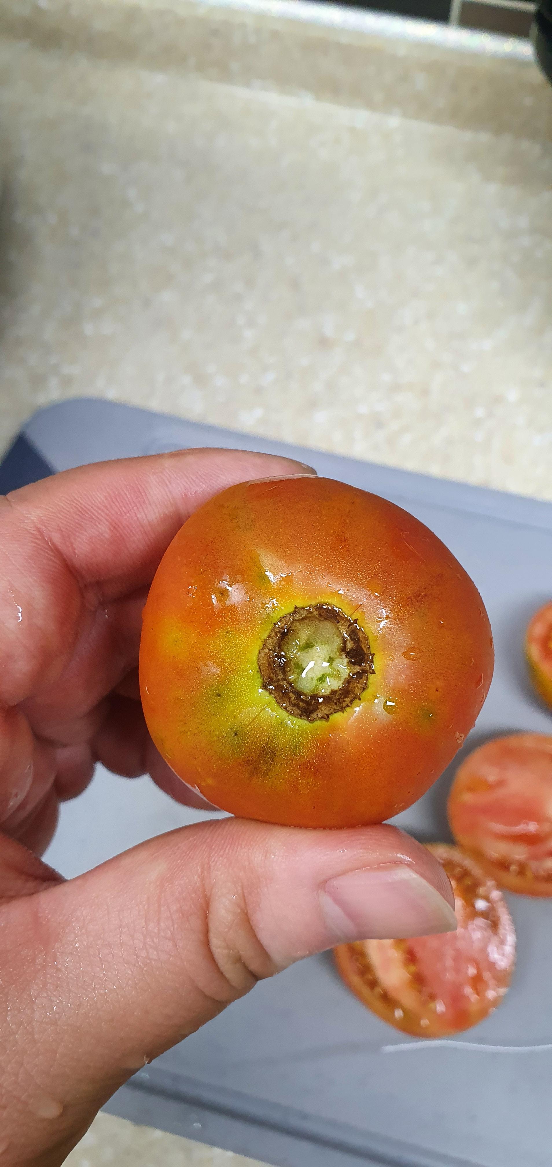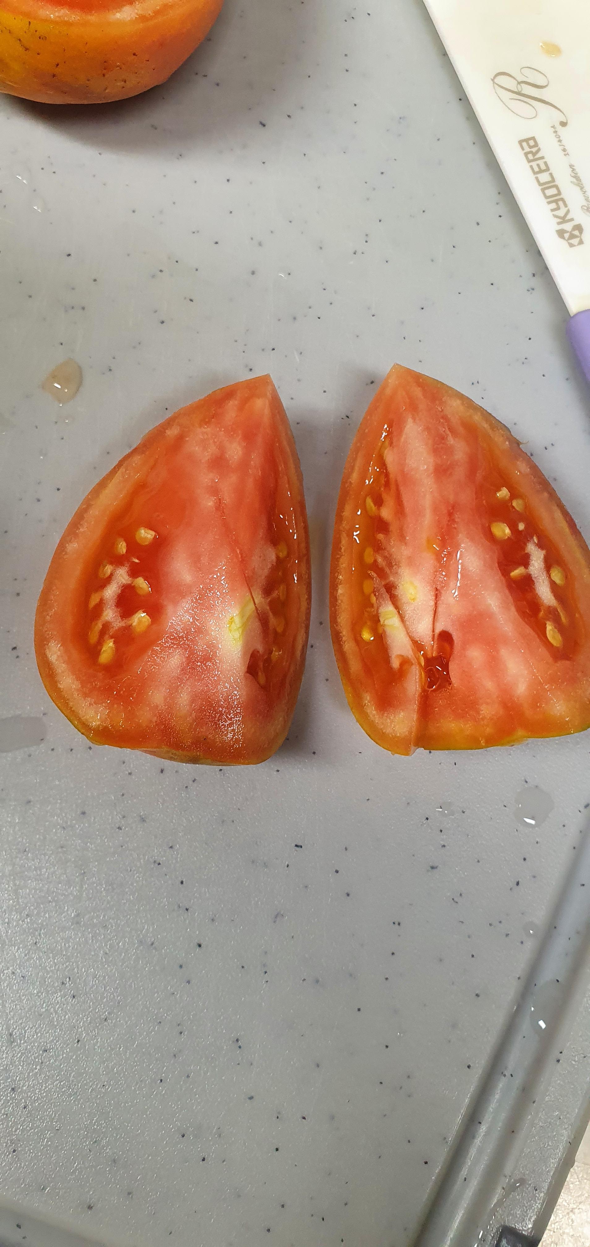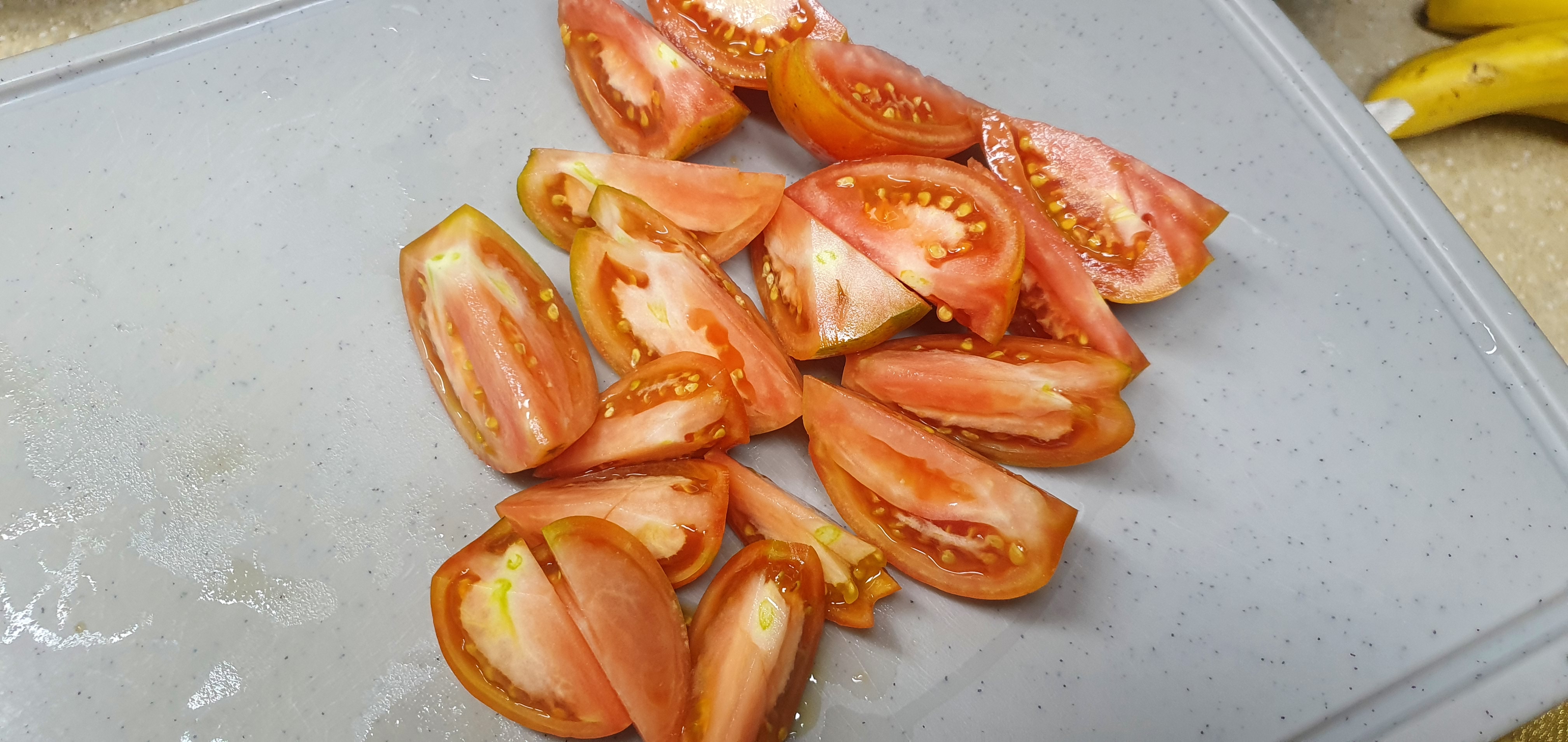 4. 이제 토마토를 먹기 좋은 크기로 잘라 줍니다! 빨리 요리 하고 싶으면 얇게 쪼금 난 식감있는걸 원한다 하면 어느정도 두툼하게!