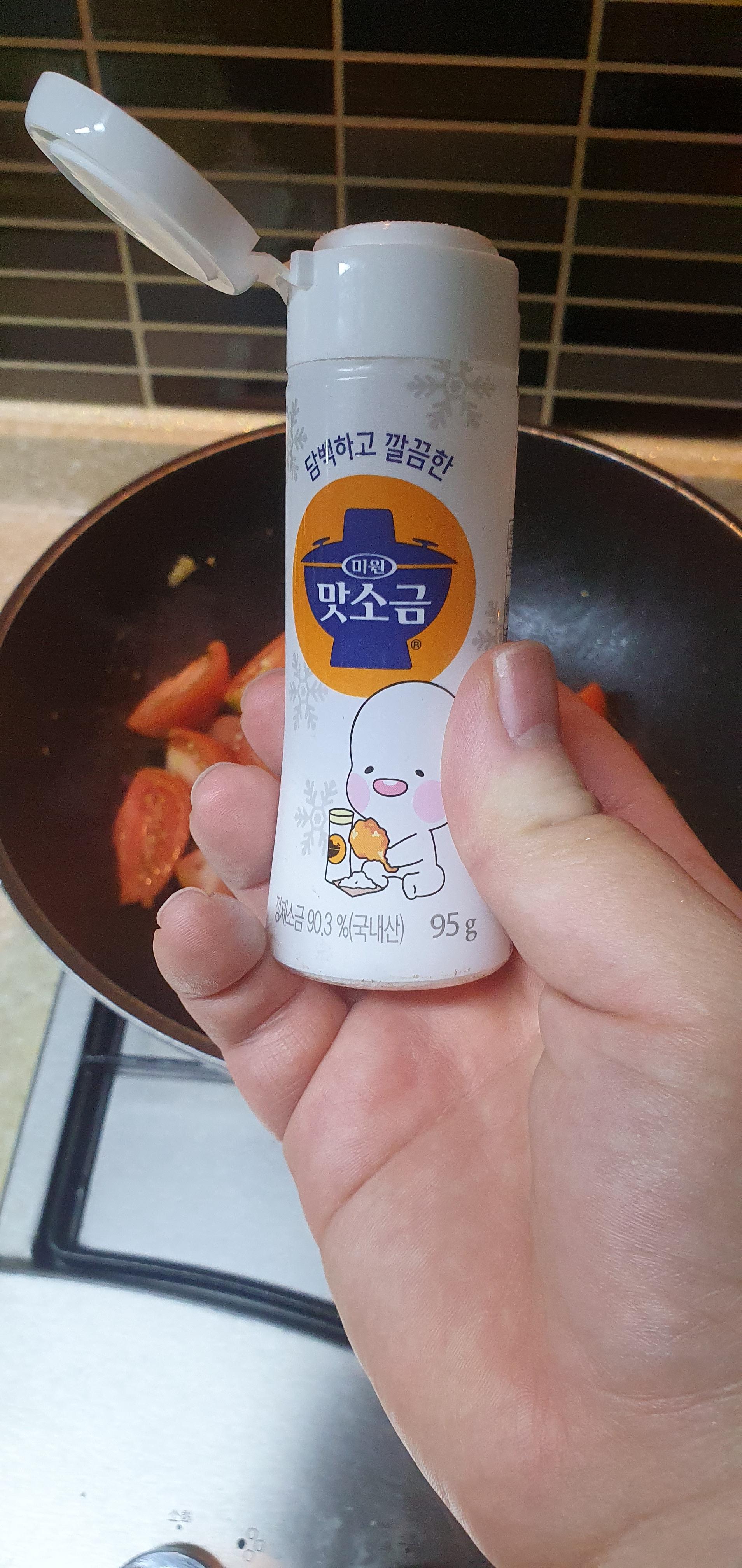 6. 쬐금 30초 정도 볶다가.. 맛소금을 투하합니다. 뭐 톡톡톡~ 세번번도 하시면 됩니다.