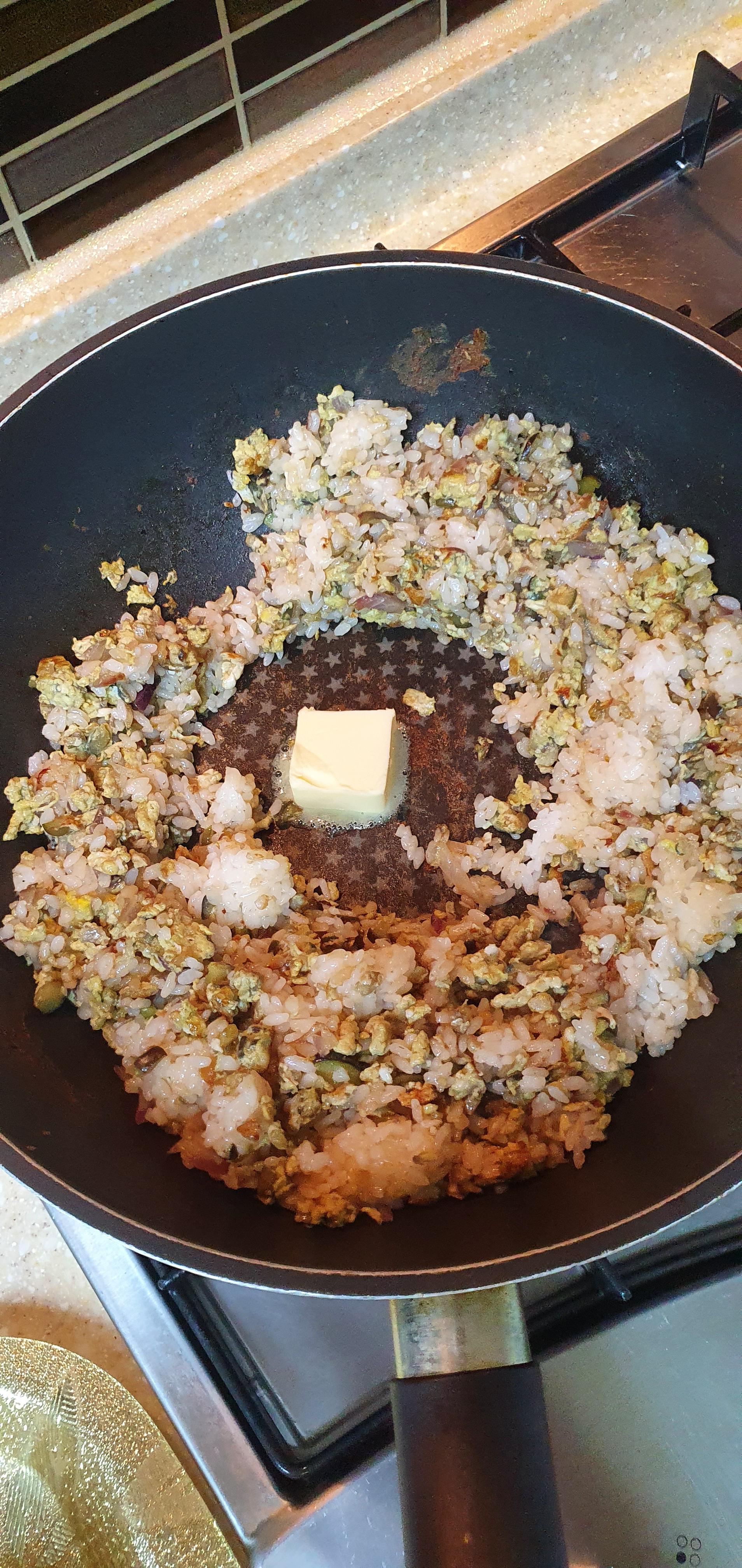 5. 버터를 1밥숟가락 정도는 넣어서 같이 볶아줍니다. 버터를 넣으면 맛이 고소해짐.