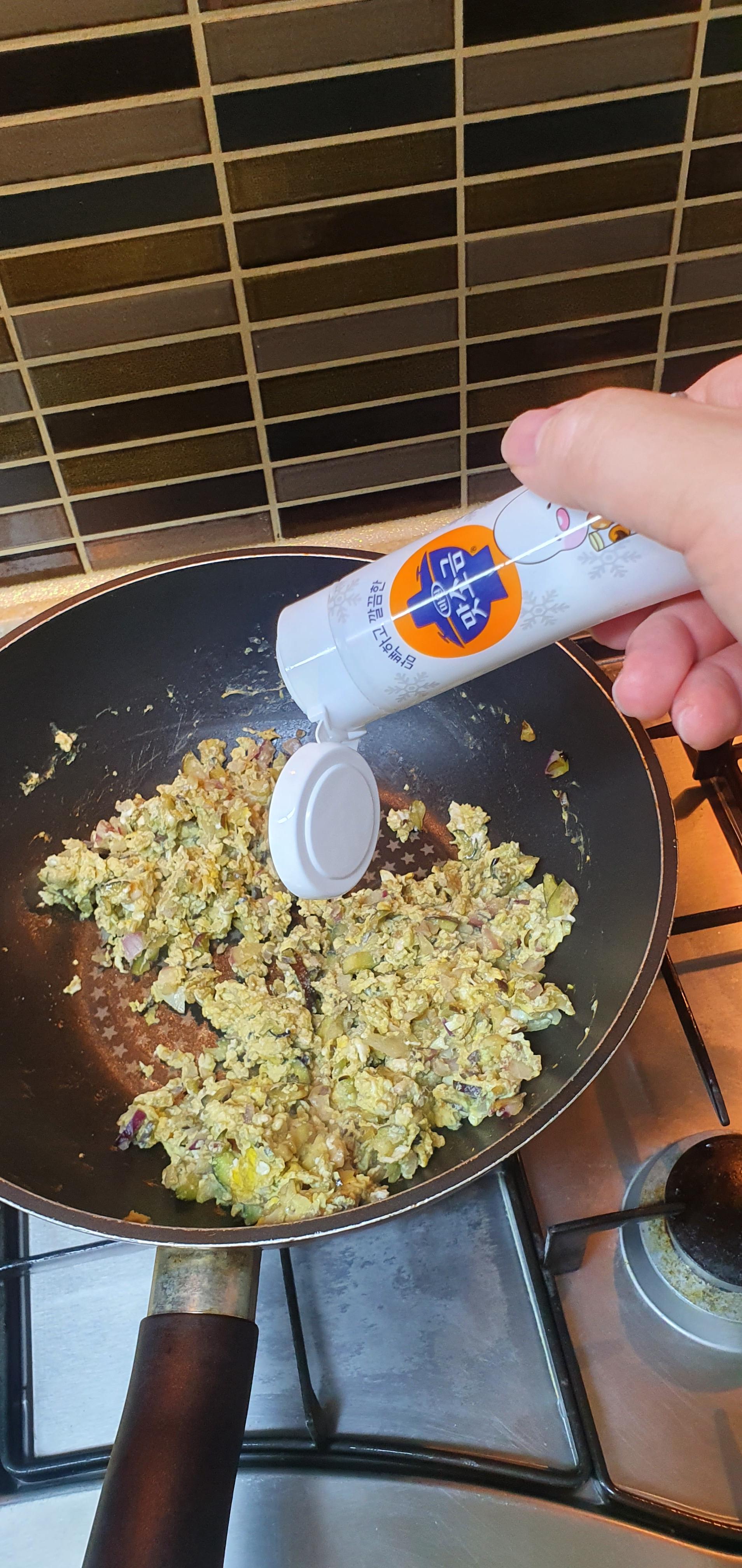 3. 한 50프로 정도 볶아주고 계란을 투하합니다. 이유 맛소금을 톡톡톡 뿌려줍니다.