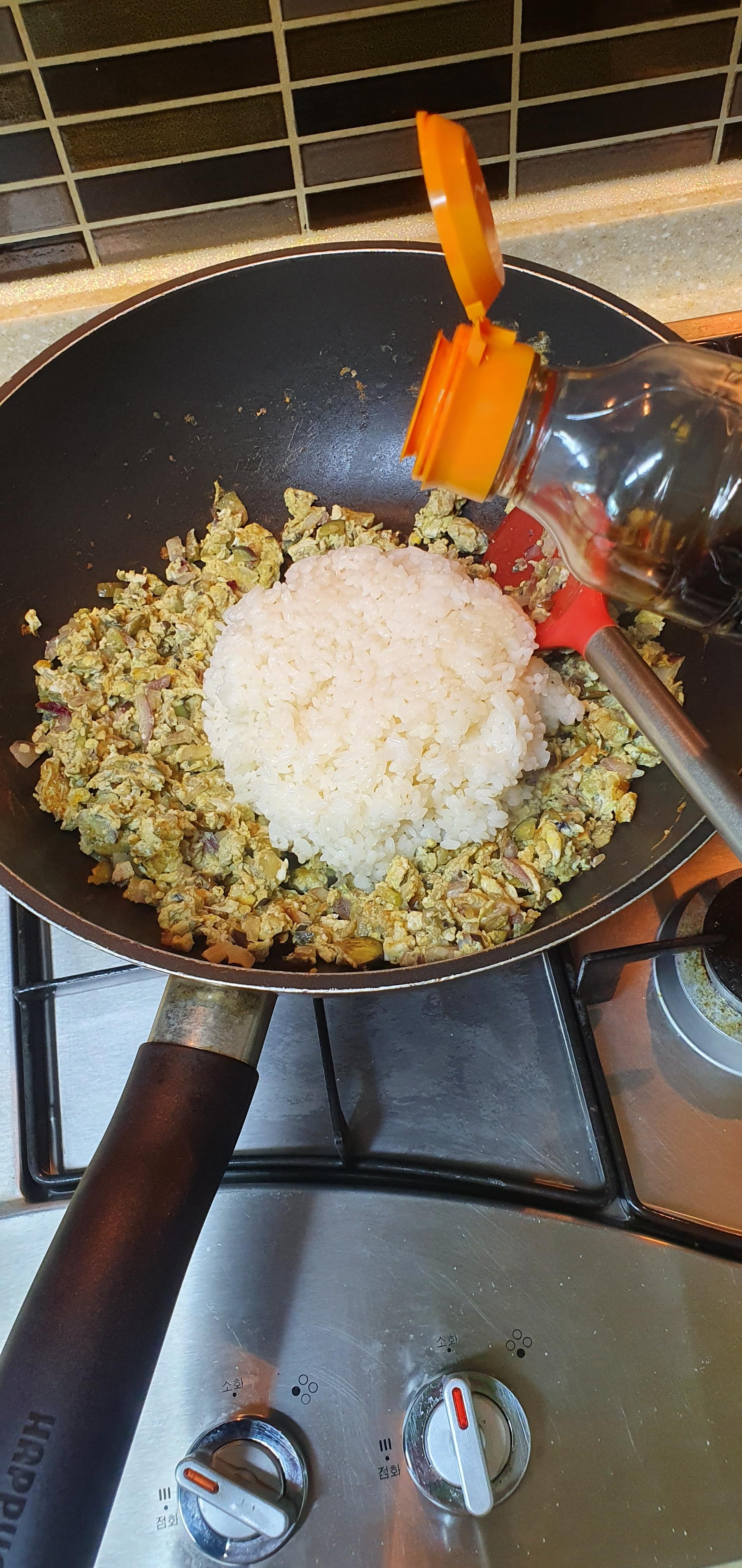 4. 이제 식은밥을 투하하고 간장을 생각보다 많이 넣어줍니다. 근데 간장을 넣는게 소금을 넣는것보다 맛있긴한데... 문제가 간장을 넣으면 색깔이 까매짐 ㅠㅠ