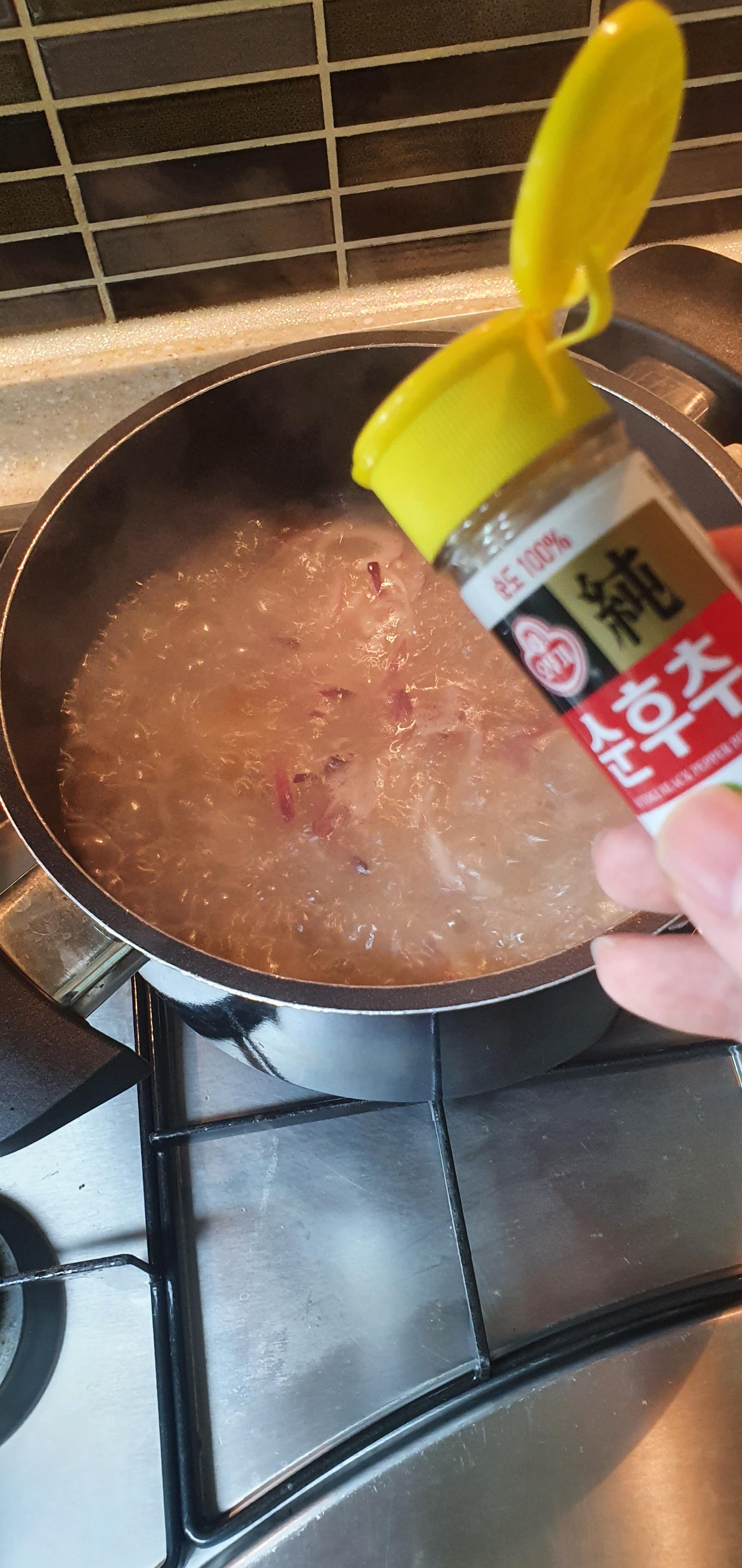3. 물이 끓으면 양파나 파, 부추를 넣습니다.
