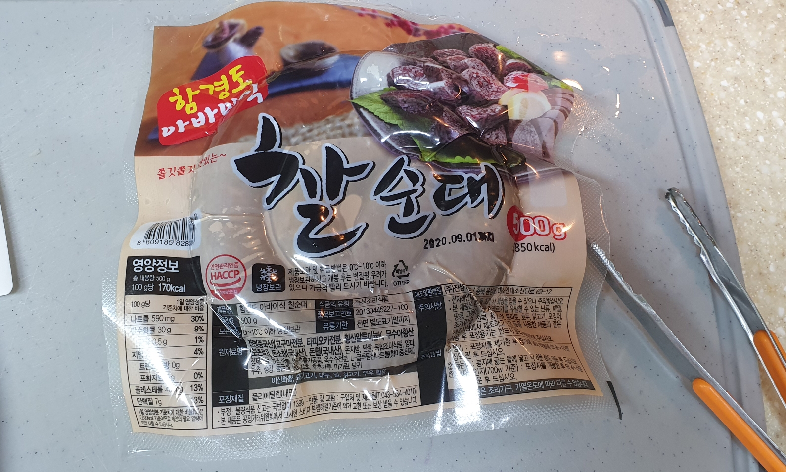 - 포장된 팩순대 1개 800g짜리 (가격 3500원)