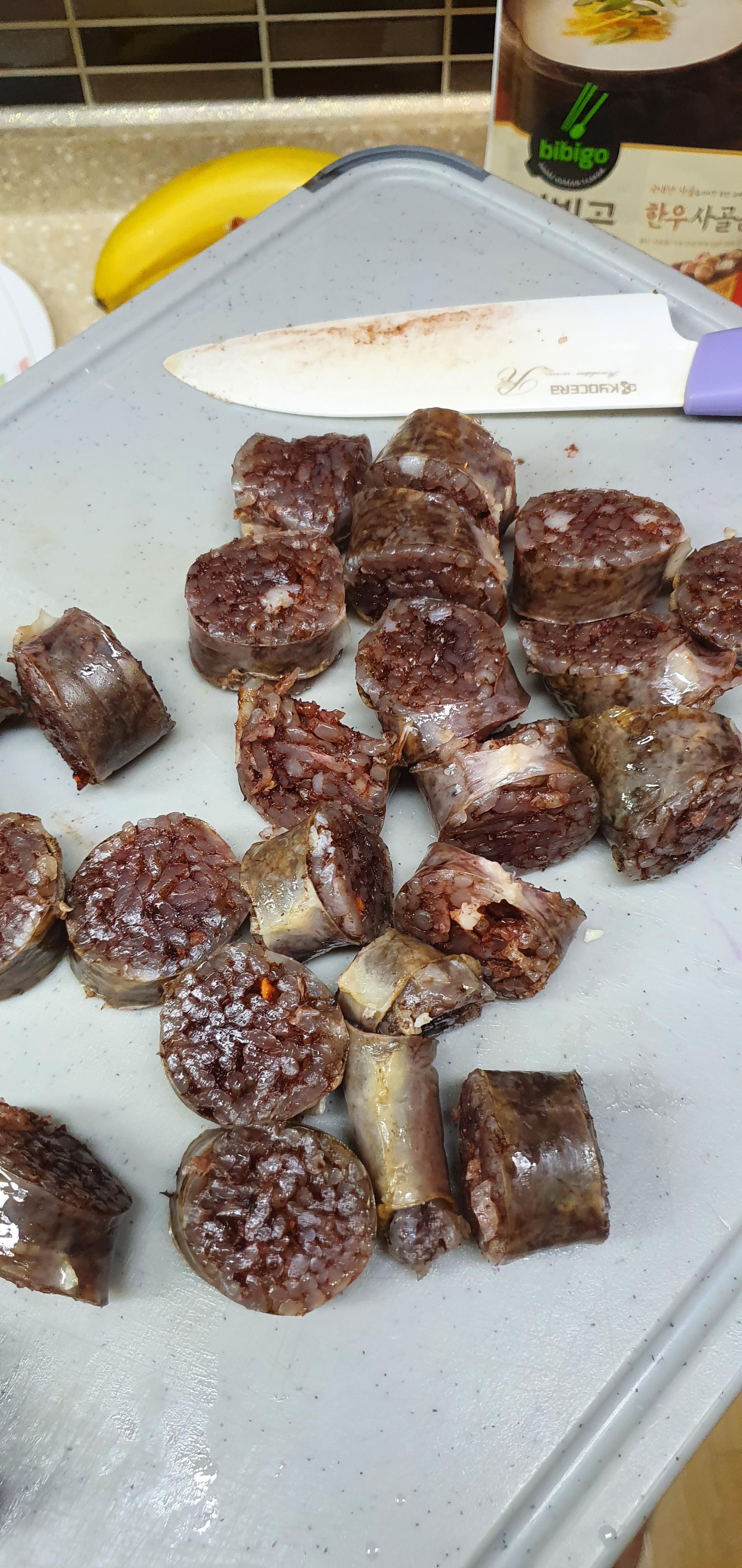 원래 돼지뼈나 뭐 그런걸로 육수를 내어서 순대국밥을 만드는데.. 우린.. 육수를 비비고 곰탕으로 한것입니다. 순대도 따로 만들수 없으니... 팩순대를 산거구여.