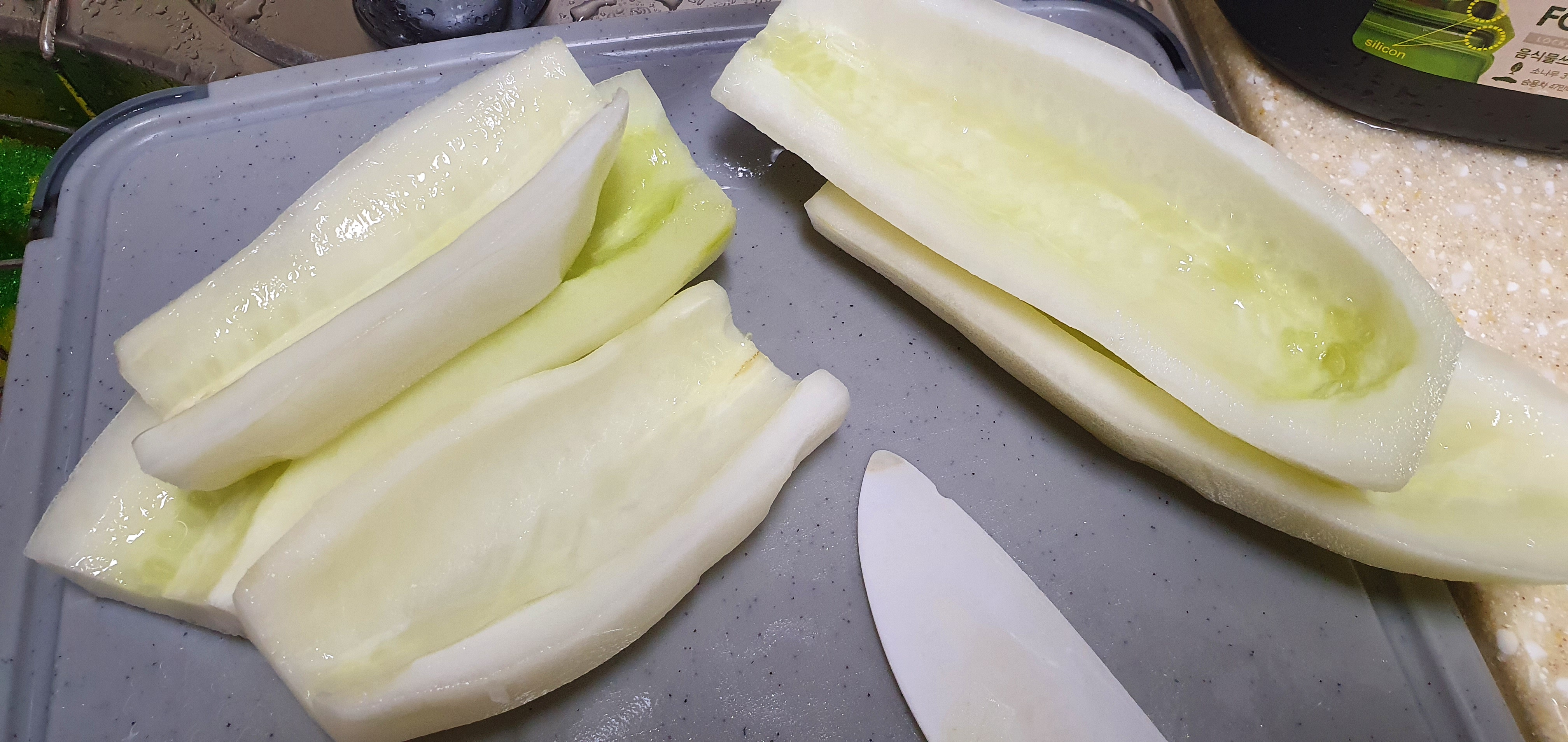 1. 노각을 껍데기를 깝니다. 속안에 씨는 숟가락으로 파냅니다.