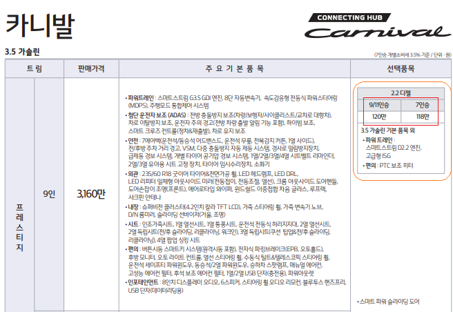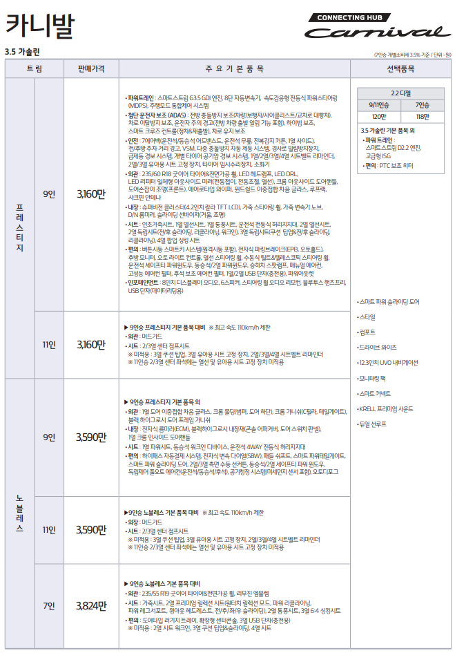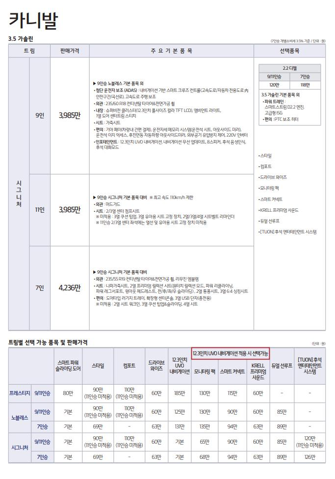 그럼 카니발 가격표 및 카니발 깡통모델 옵션을 한번 봅시다!