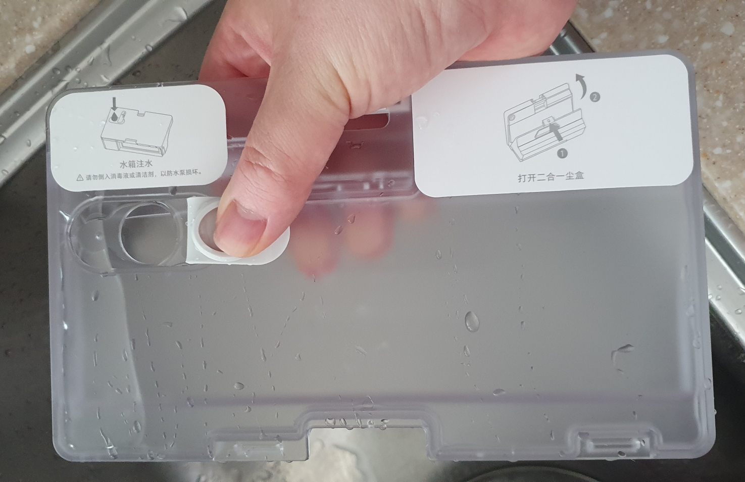 전면에는 동드랗게 타원형으로 버튼이 2개와 먼지통과 걸레용 수조가 숨어 있다.