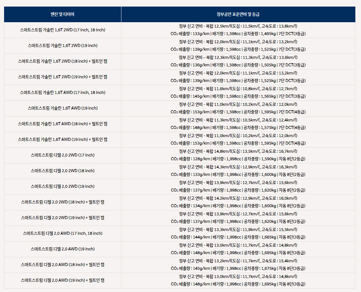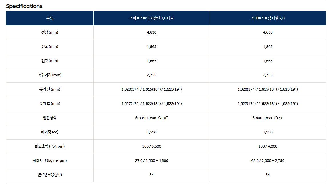 우선 라인 1.6리터 터보 가솔린 라인이 기본이며 옵션으로 2.0 디젤 스마트스트림 엔진을 선택할 수 있습니다.