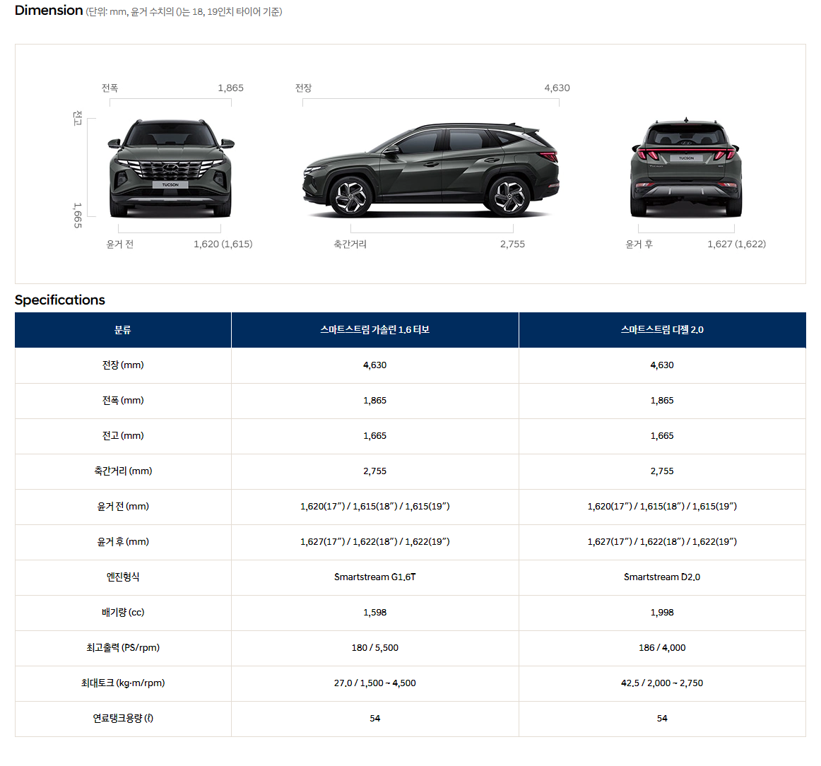 우선 신형 투싼의 제원을 봅시다!