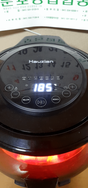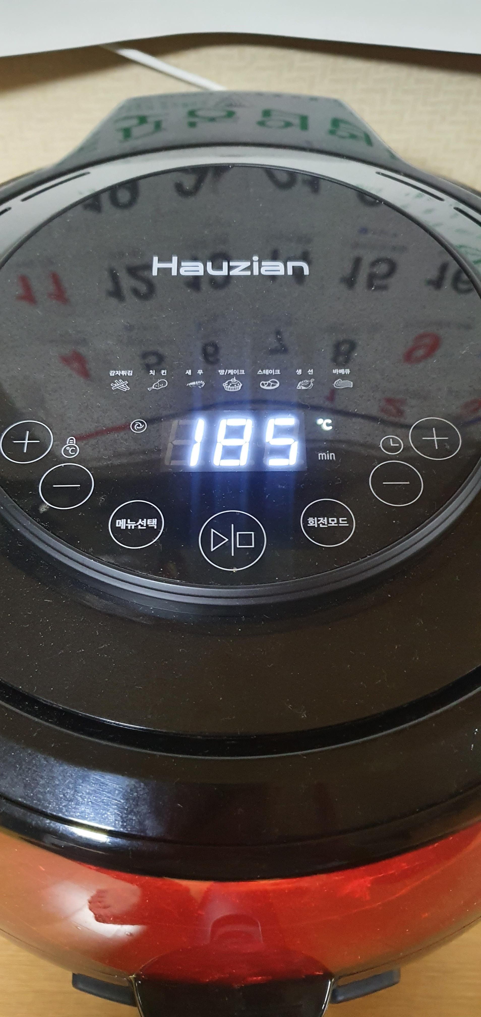 1. 1차 굽기 - 에어프라이어 설정 : 온도 185도, 시간 30분을 선택하고 조리를 시작합니다.