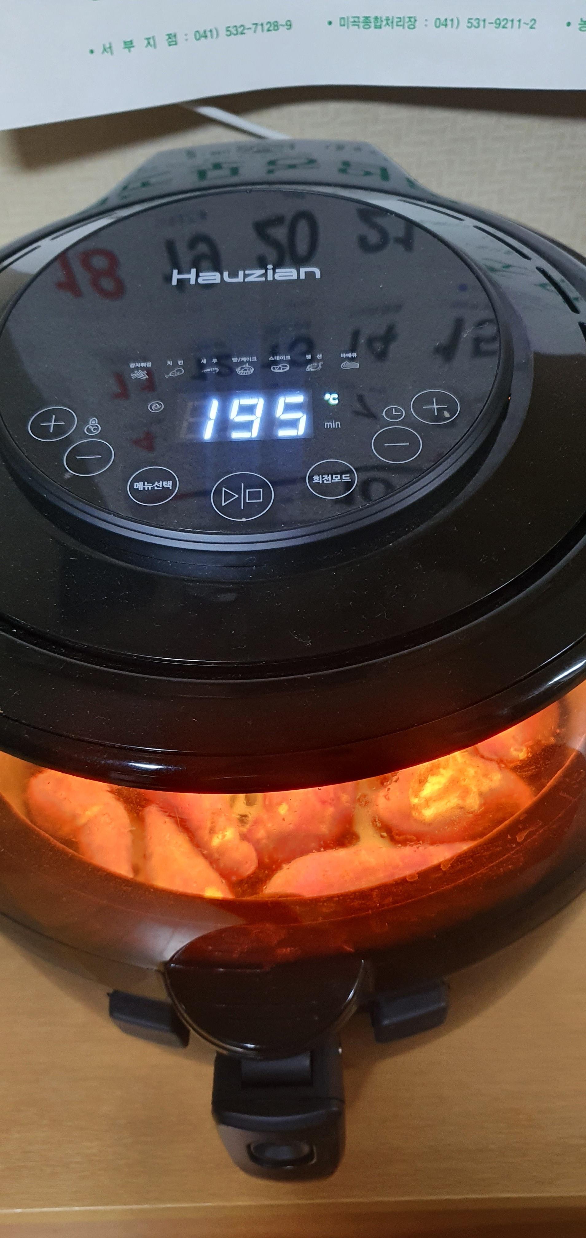 3. 2차 굽기 - 에어프라이어 설정 : 온도 195도, 시간 15분을 선택하고 조리를 시작합니다.
