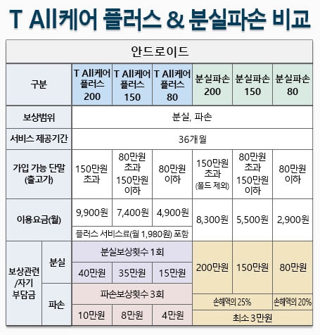 "t all care plus & 분실파손 비교" 라고 써져 있는 칸만 보시면 됩니다.