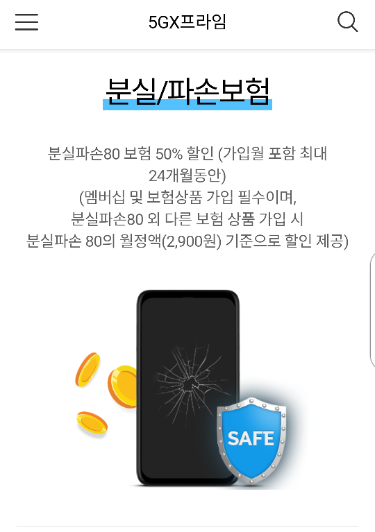 즉, skt의 89요금제에선 제공하는 스마트폰 보험 50%할인은 내가 구매하는 폰이 출고가가 80만원이하이면서 보험을 분실파손80을 선택해야 보험료 50%가 할인되는거지..
