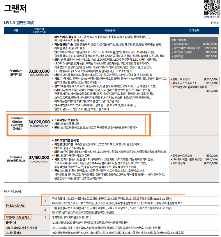 첫번째 차량은 지금 생산하는 모델 (그랜져lpi 프리미엄초이스 + 옵션 : 파킹어시스트플러스1 + 현대스마트초이스1)
