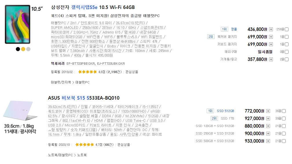 테블릿 갤럭시 탭 s5e VS 노트북 아수스 비보북s15