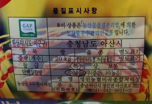 등급은 특등급, 단백질함량은 수!