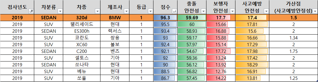 2019년 KNCAP 국내차량 안전성 점수표입니다.