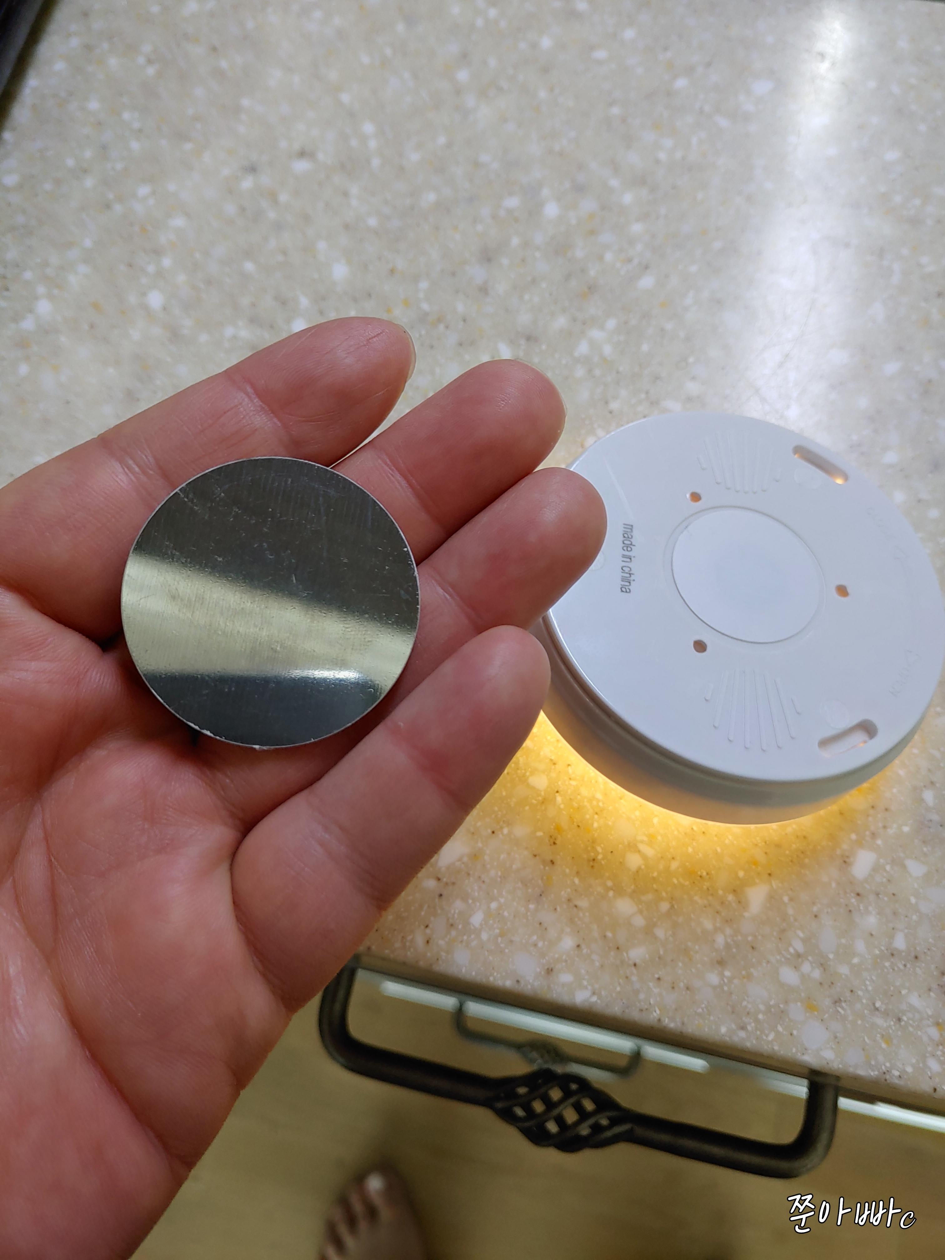 자성이 없는 곳이 붙여야 하는 경우는 같이 동봉면 동그란 쇠부치를 벽에다 붙이고 거기 위에 무선 센서등을 놓으면