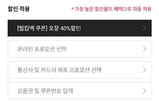 통신사 및 카드사 제휴프로모션 선택할인 항목을 터치하고,