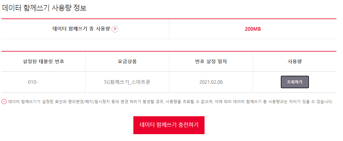 my T - 데이터/통화관리 - 나의잔여데이터/통화 메뉴로 들어가보면 아래처럼 데이터 함께쓰기가