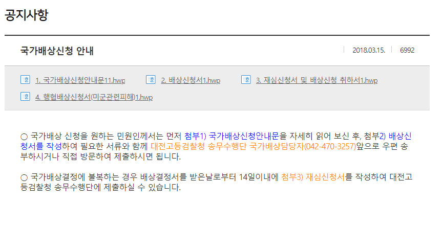 : 국가배상신청이 접수가 완료된후 고등검찰청에서는 해당 지자체로 관련 공문을 발송합니다.