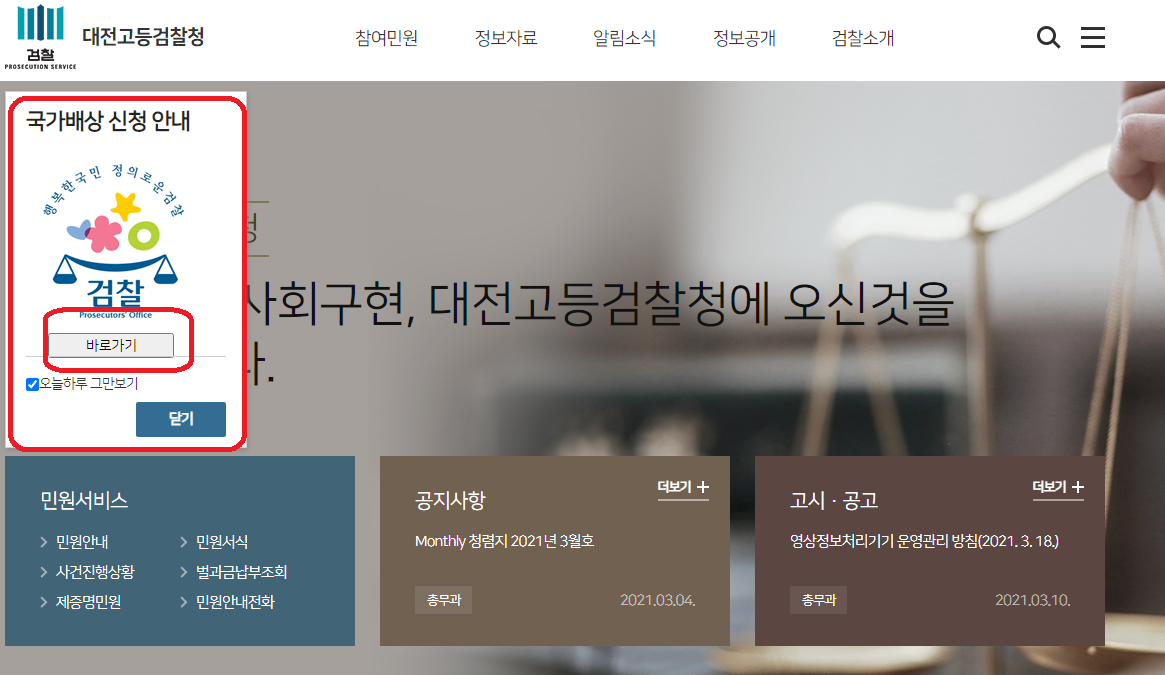 2) 대전고등검찰청 홈페이지 첫 화면에 "국가배상" 관련 창이 떠있다. 그 창을 클릭!