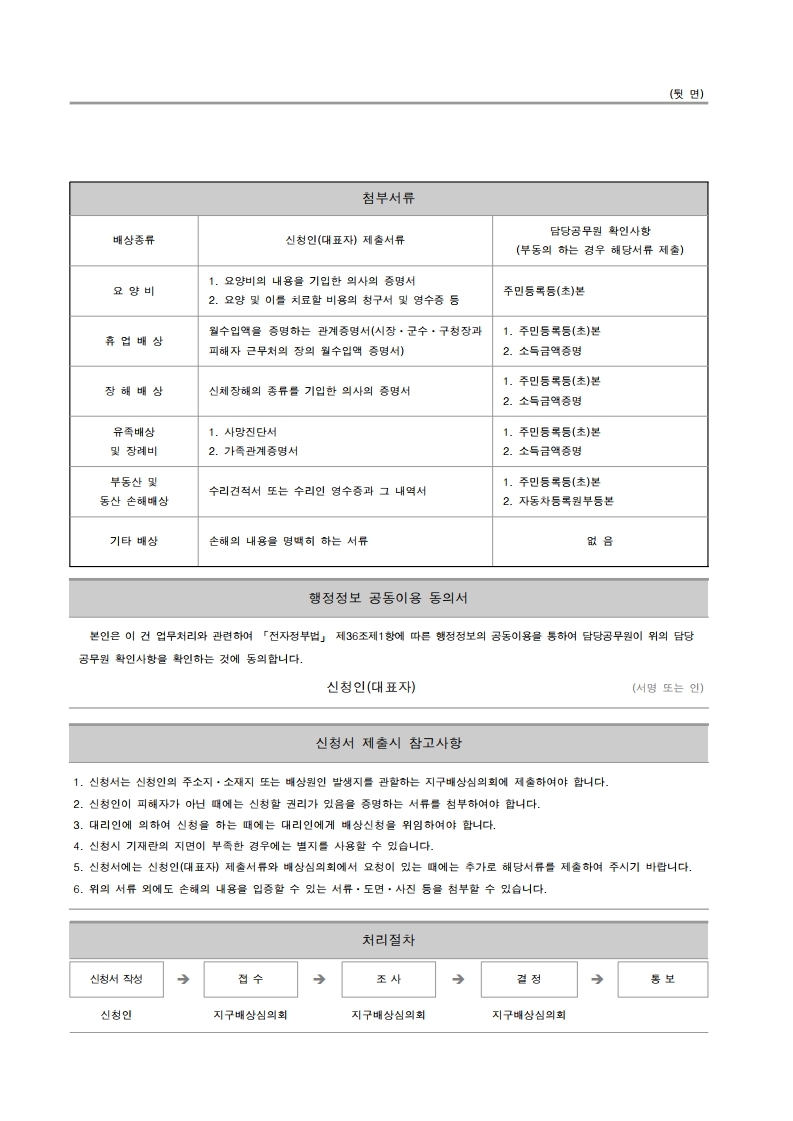 ○ 국가배상은 과다·허위청구 등 제도의 악용을 방지하기 위해 비용지출 후의 사후지급을 원칙으로 하고 있으므로, 일단 수리를 마친 후 그 영수증을 신청서와 함께 제출