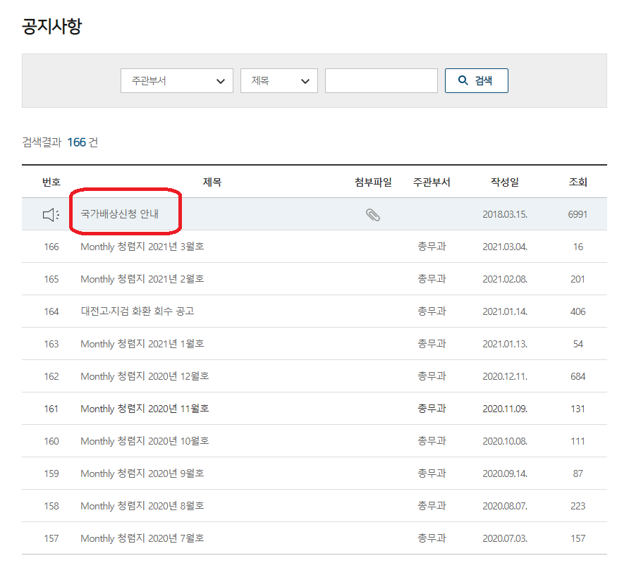 첫번째 게시글이 "국가배상신청 안내" 떠 있습니다. 그걸 클릭!