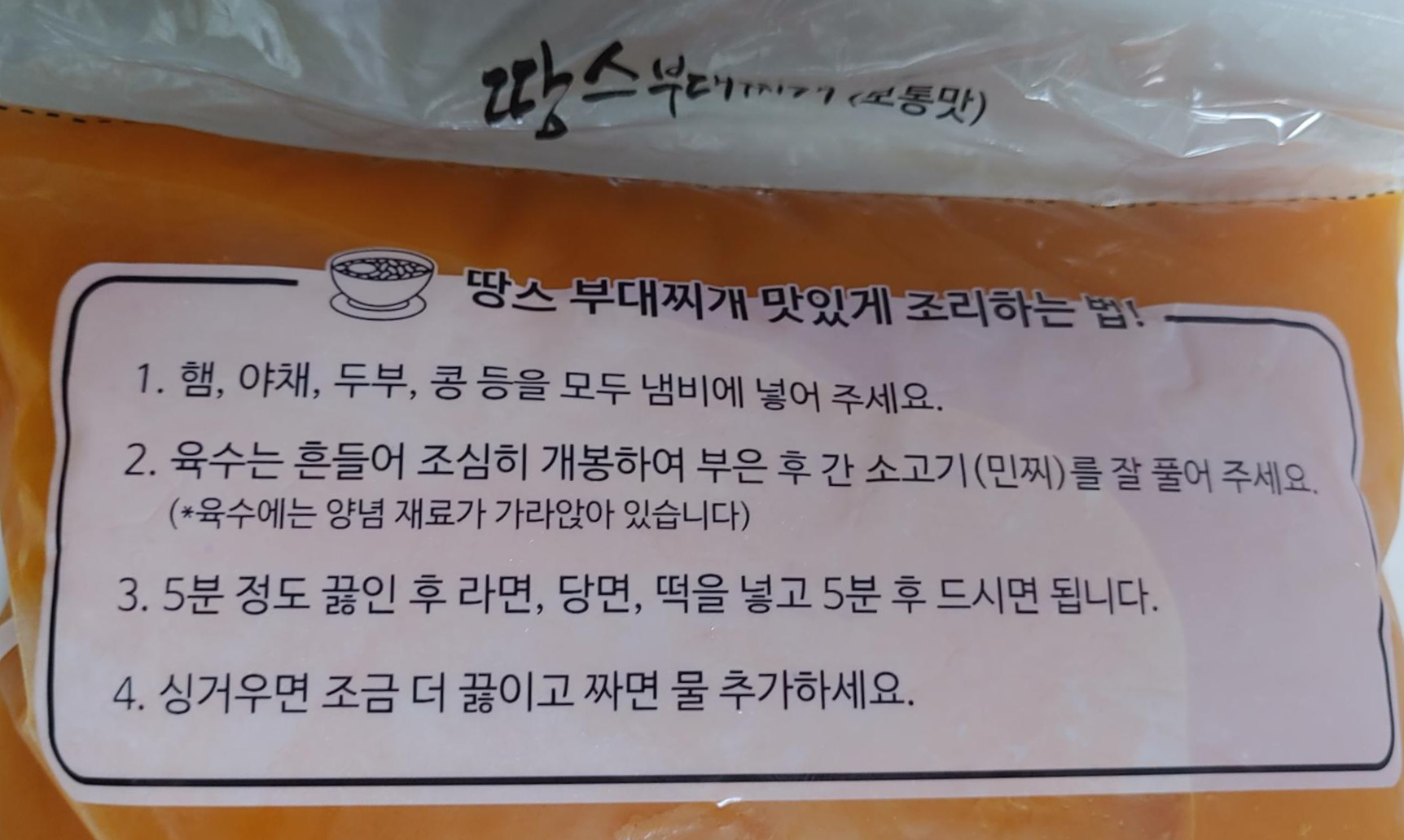 충남 천안 직산읍에 위치한 땅스부대찌개에서 부대찌개를 포장해 왔습니다.