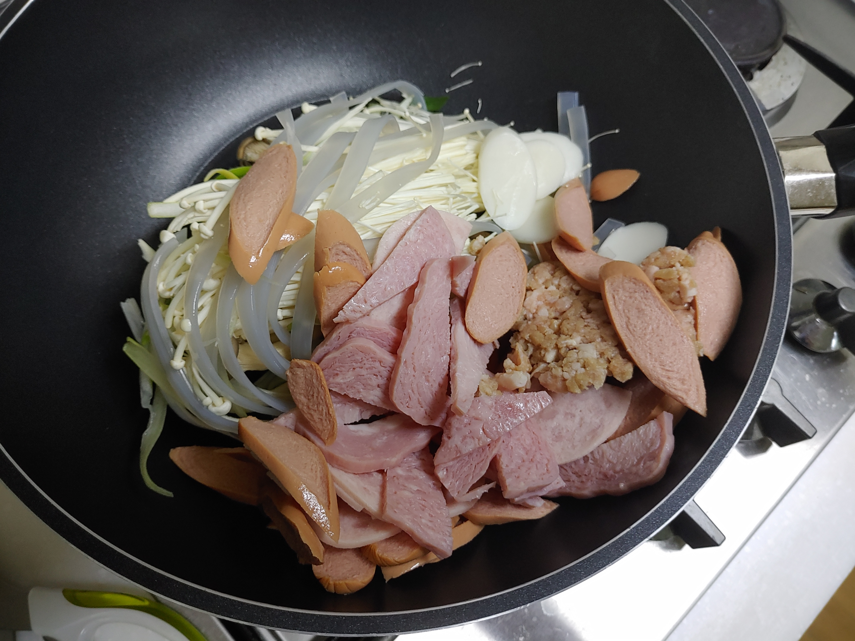 그냥 재료를 몽땅 그릇에 넣고, 육수 넣고 끓이다가, 펄펄 끓게되면 라면 사리를 넣어서 먹으면 됩니다.