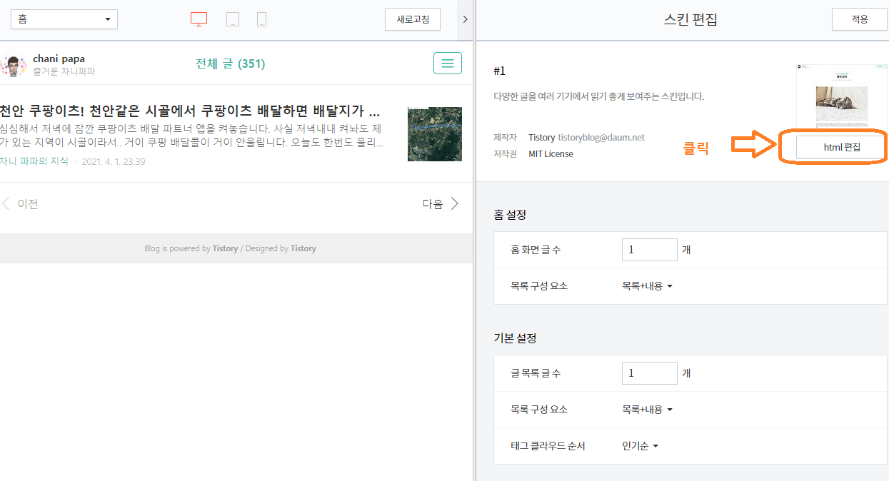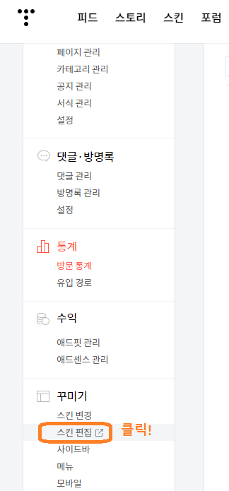 1. 티스토리 블로그 설정화면으로 들어간다음! "스킨편집"을 선택한다.