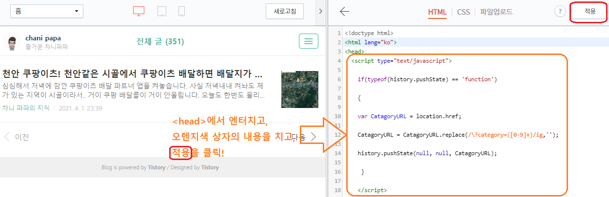 "<head>" 바로 밑에 부터 타이핑하고 "적용"을 클릭해주면 끝!
