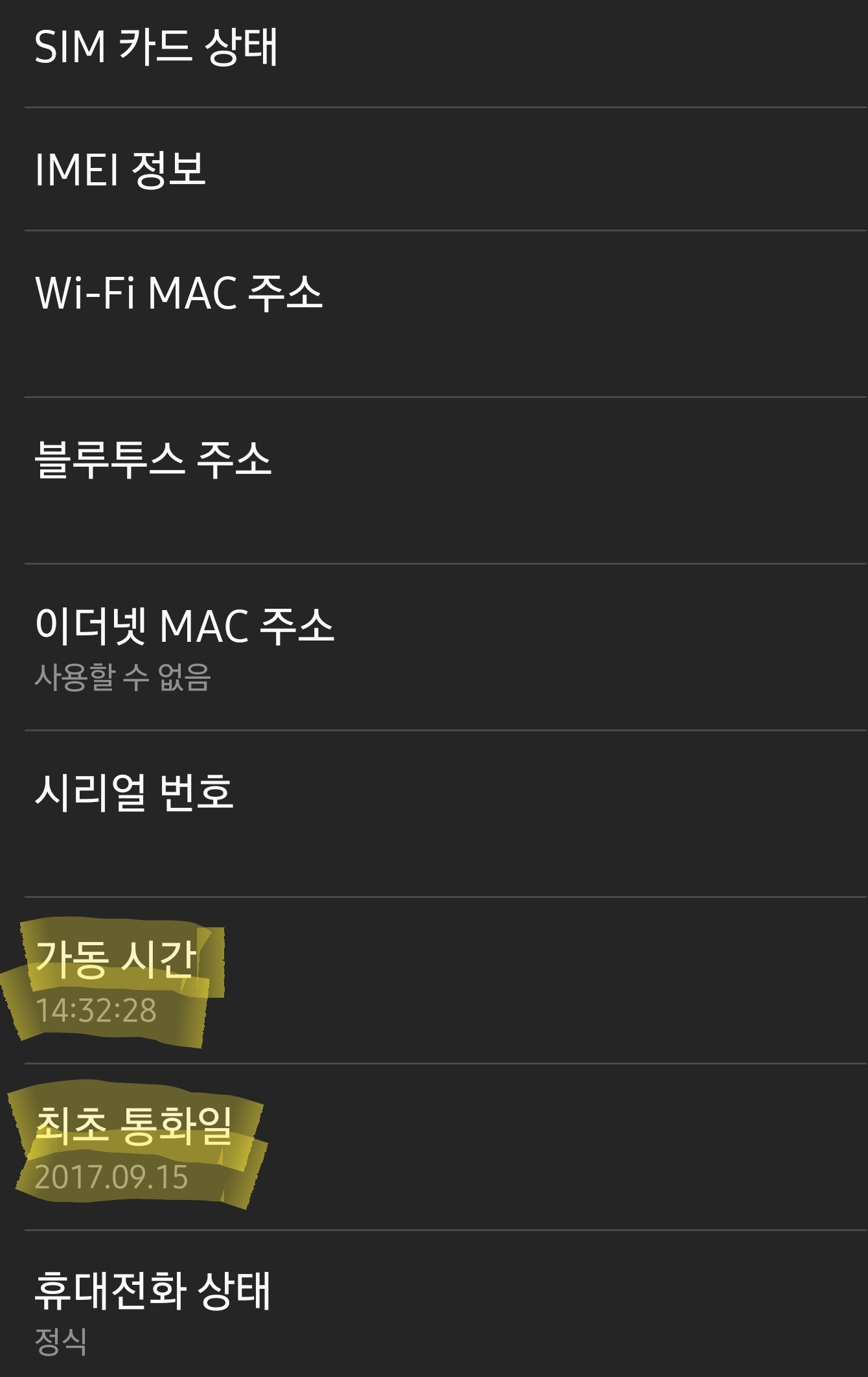 여기서 스마트폰 최초 사용일= 최초 통화일을 볼수가 있습니다.