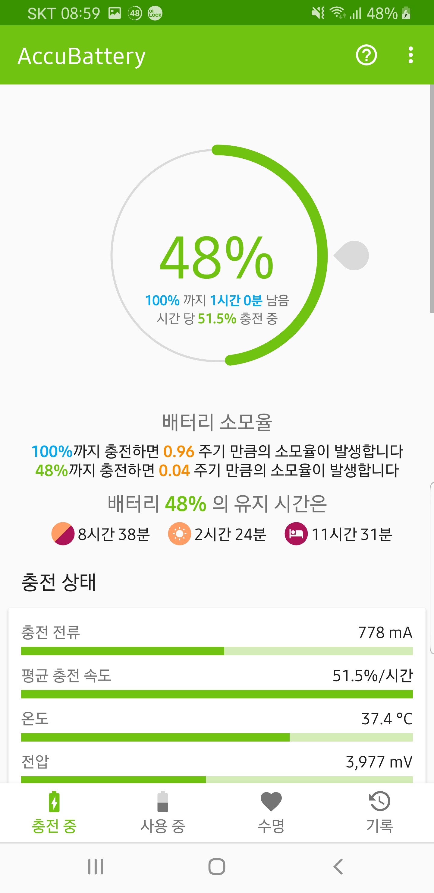 이 중고 스마트폰인 노트8의 베터리 수명이 얼마나 될까? 궁금하였습니다.