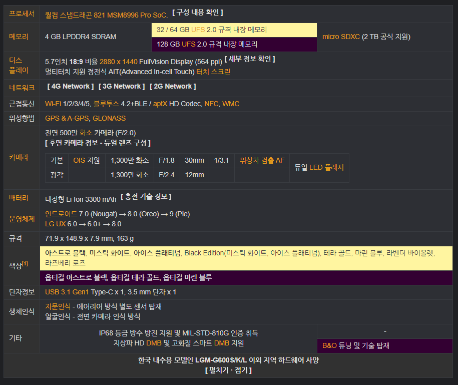 스냅821, 3300mAh 베터리, 64기가 저장공간, 4기가램, 외장메모리슬롯, ip68방진방수, 밀스펙인증, 엘지페이