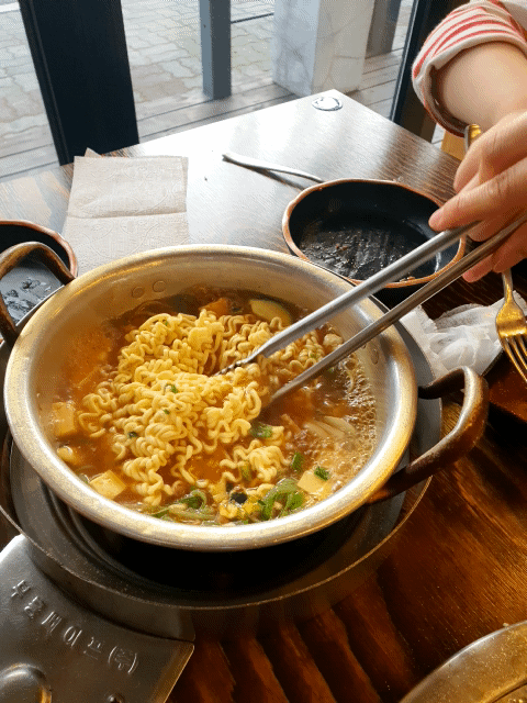 뜨거운 물을 바로앞 정수기에서 받아서 테이블마다 있는 가스렌지에 올려서 즉석 라면으로 먹으면 됩니다. ㅎㅎㅎ