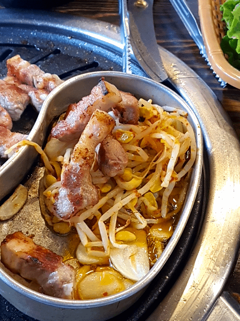 양파절이와 콩나물 김치 쌈 그리고 고기 옆에 반합 뚜껑이 있는데.. 챔기름이 들어 있어요. 거기에 슬라이스 마늘이랑 콩나물이랑 볶아서 고기랑 냠냠 하면 맛있어용 ㅎㅎ