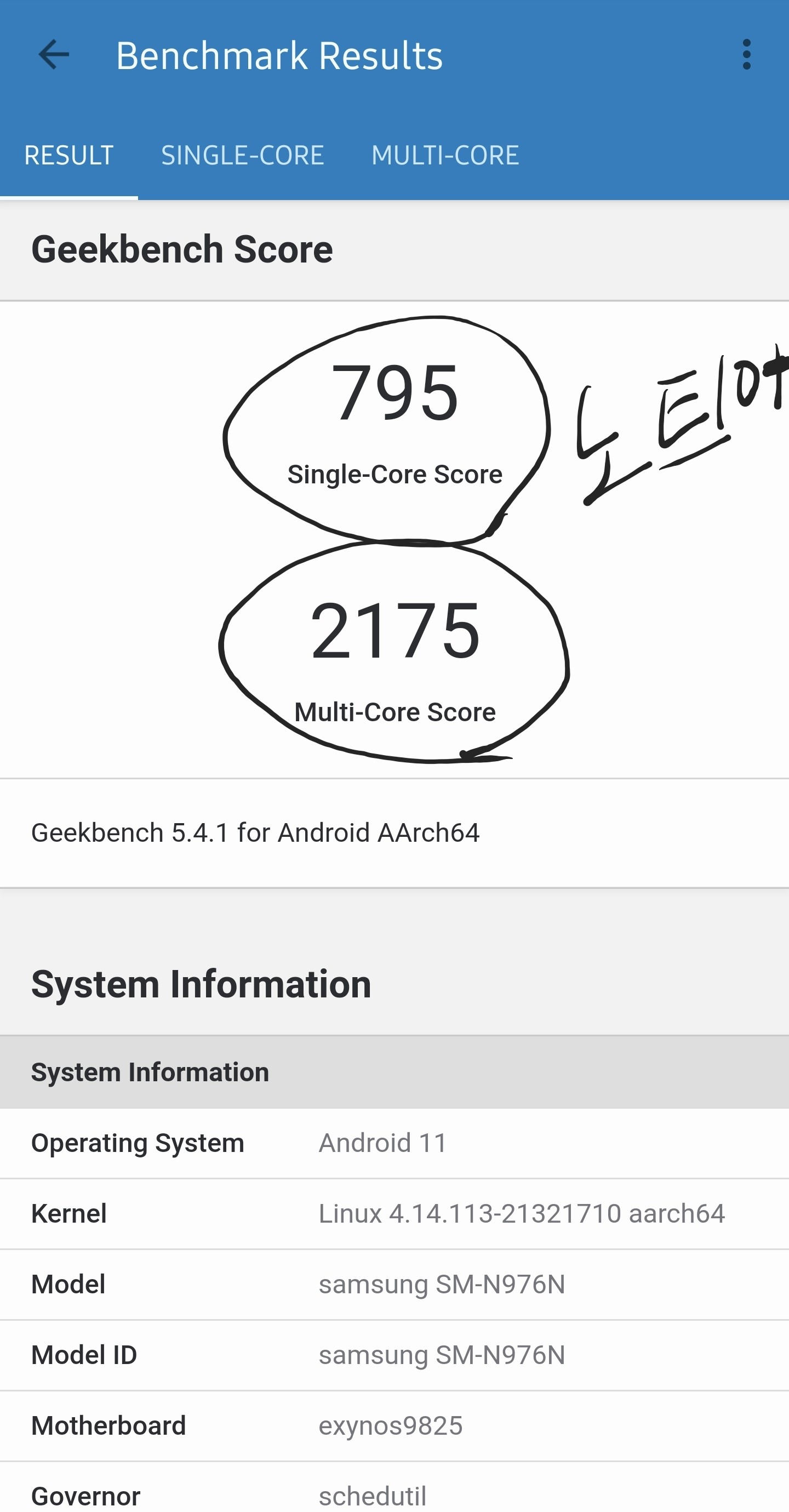 노트10+ 긱벤치 마크 점수는 아래 사진과 같습니다.