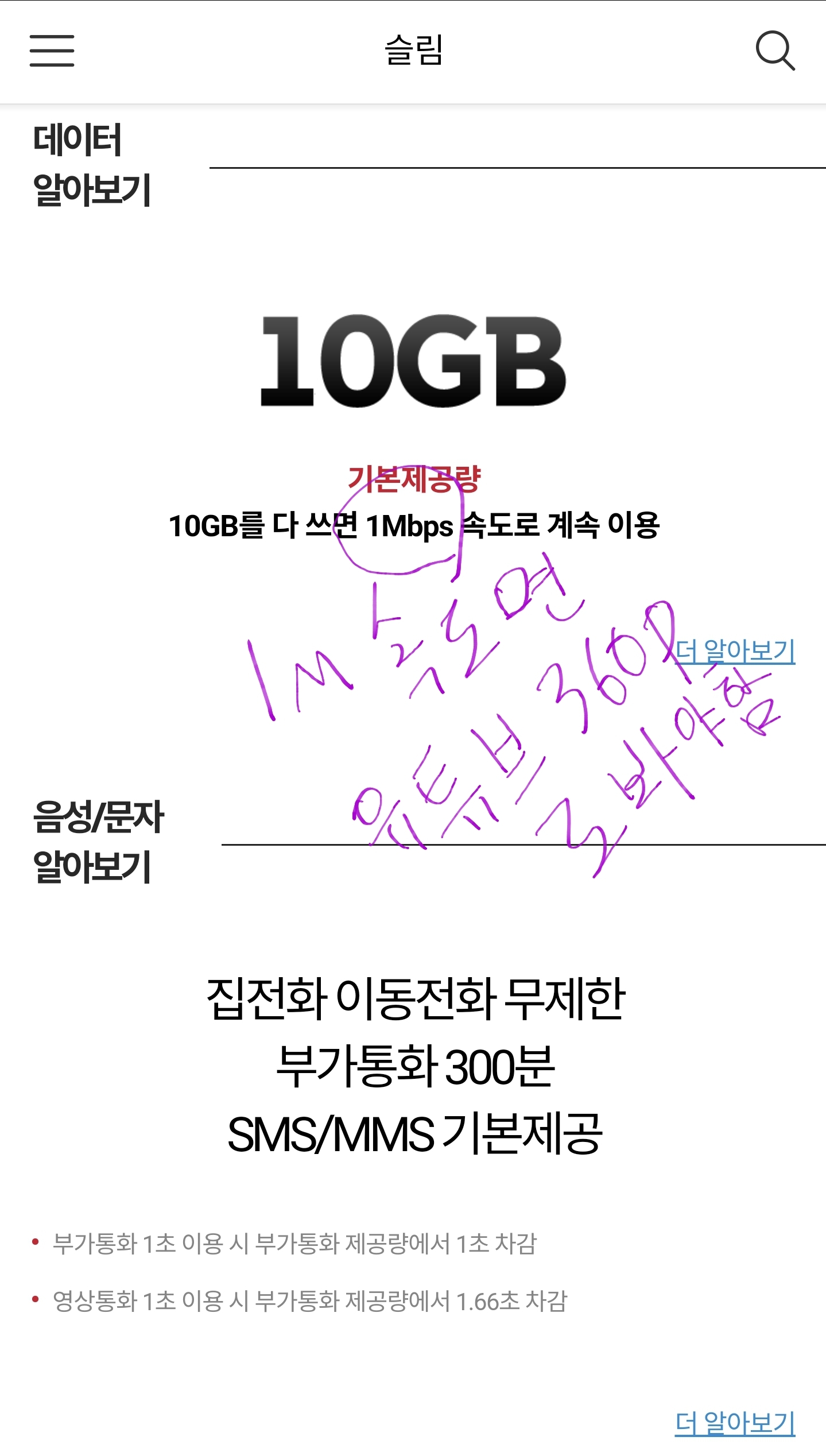 이 슬림요금제 역시 무제한 데이터 요금제이긴합니다.