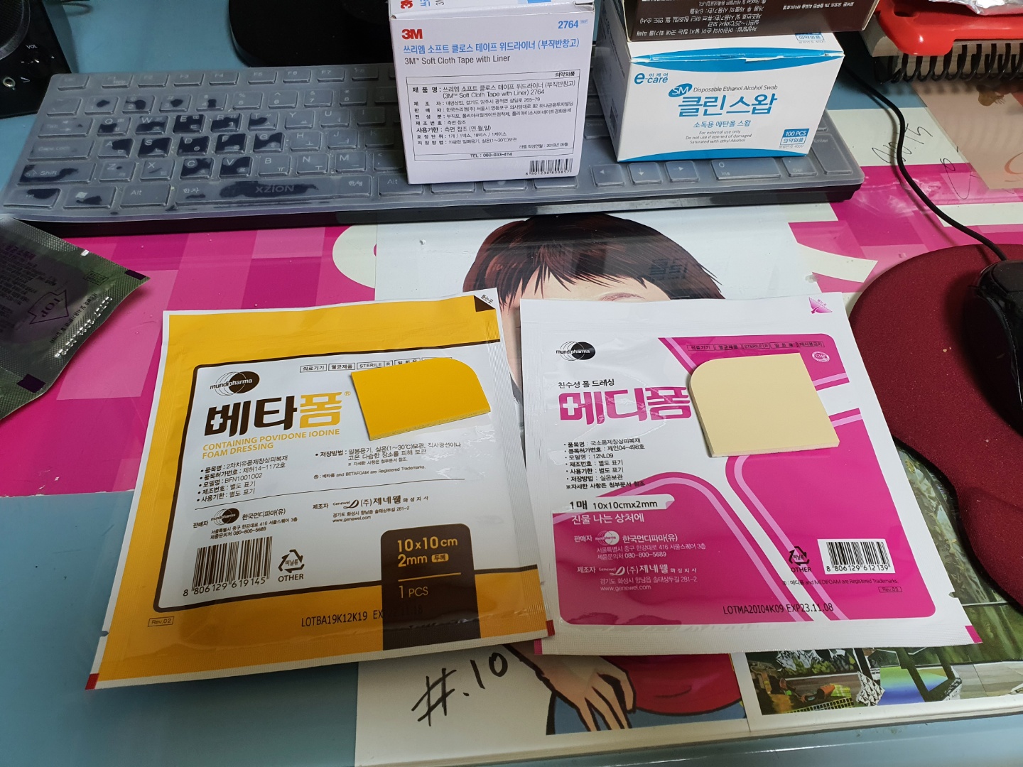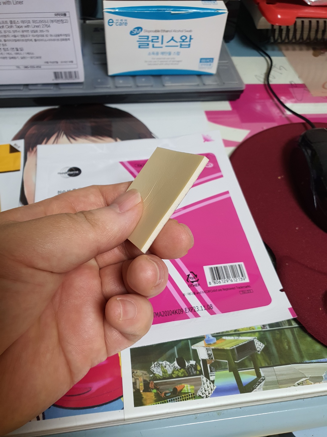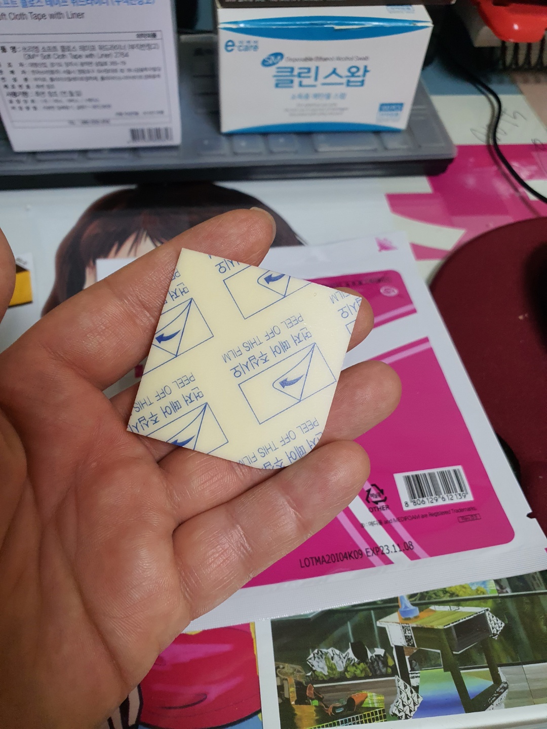 : 우선 기존에 붙어있는 부직 반창고를 떼어내기 위해서 에탄올 스왑을 이용해서