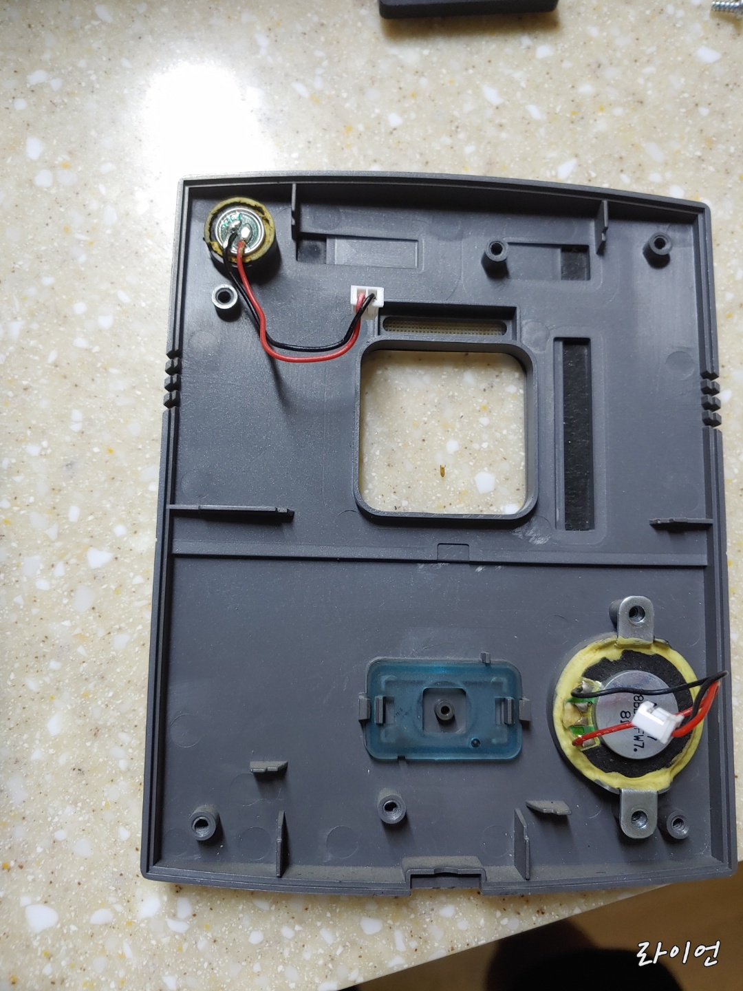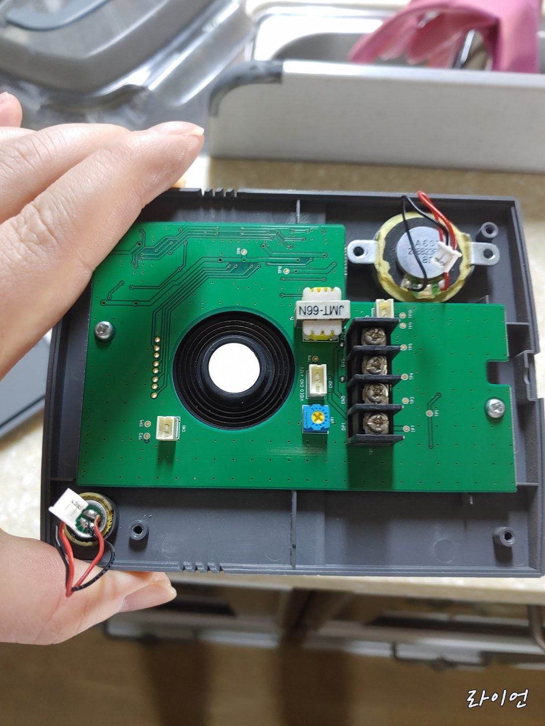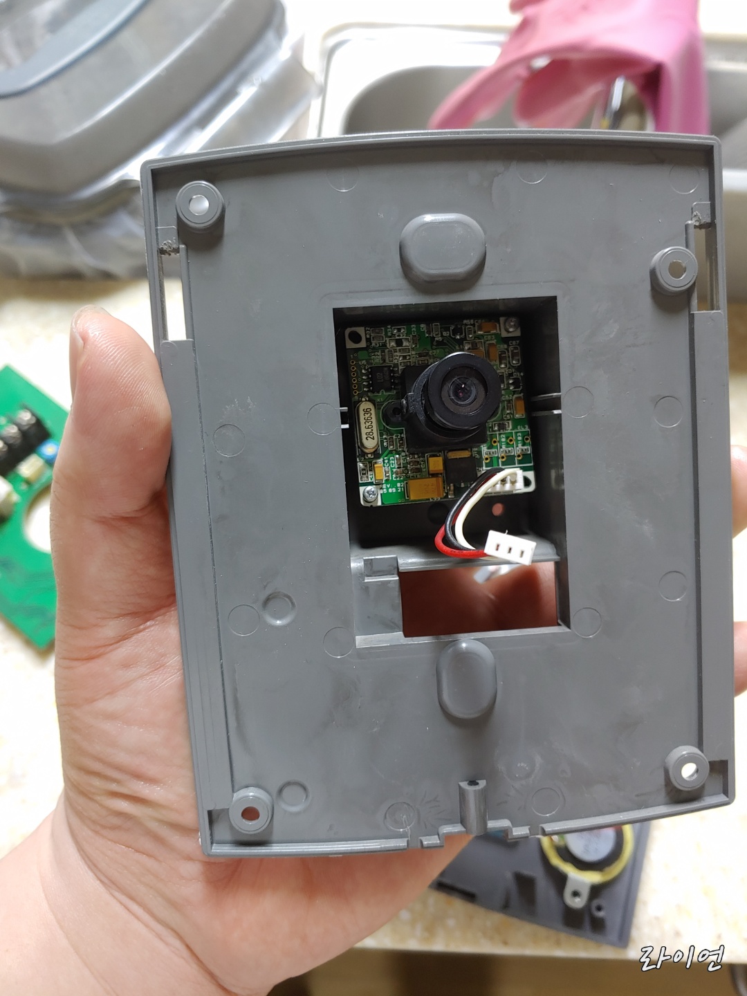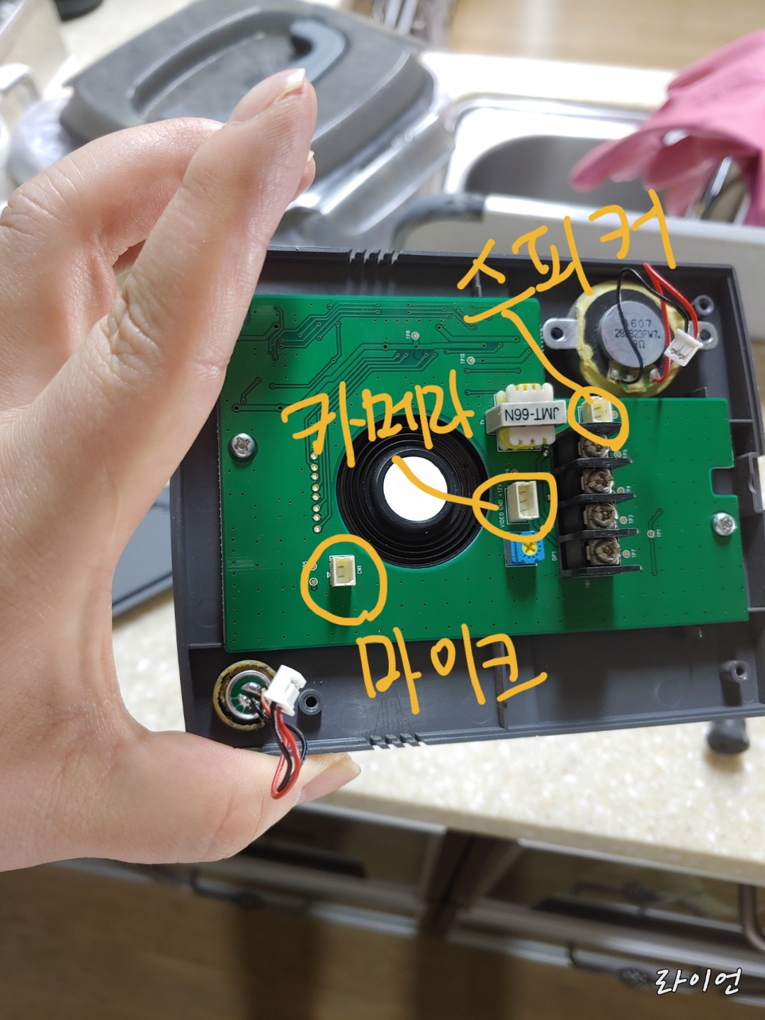그담앤 기판에 마이크와 스피커 부분의 커넥터를 빼주고 + 볼트 2개 풀어주면 초인종 pcb기판만 딸랑 떨어집니다.