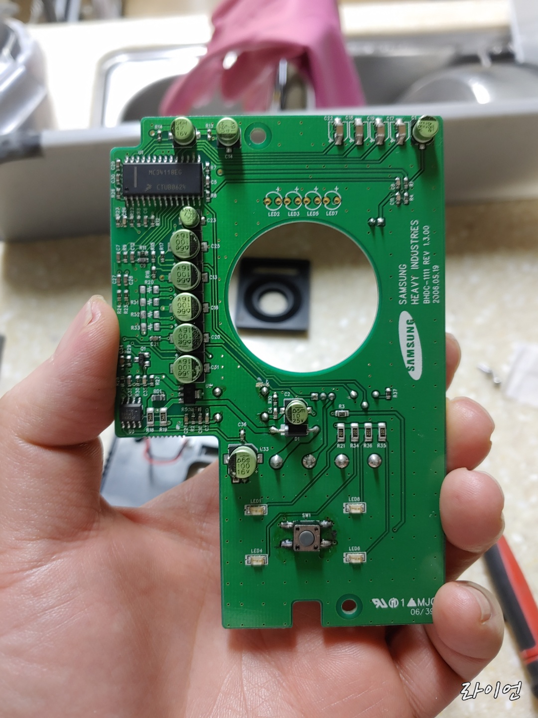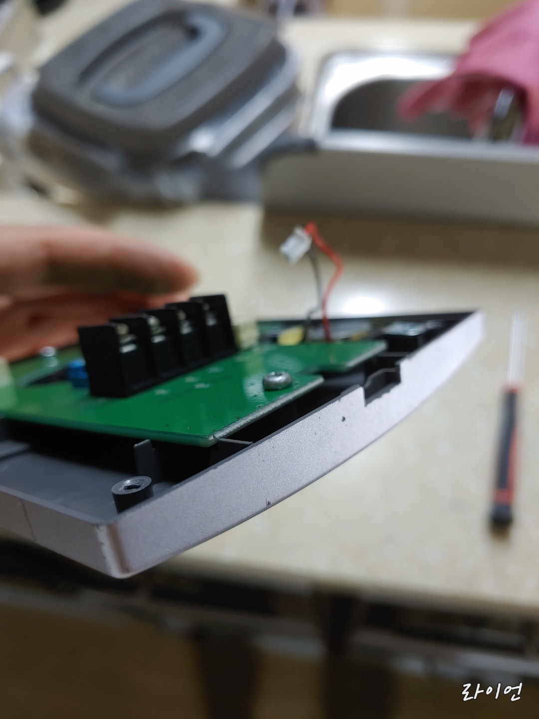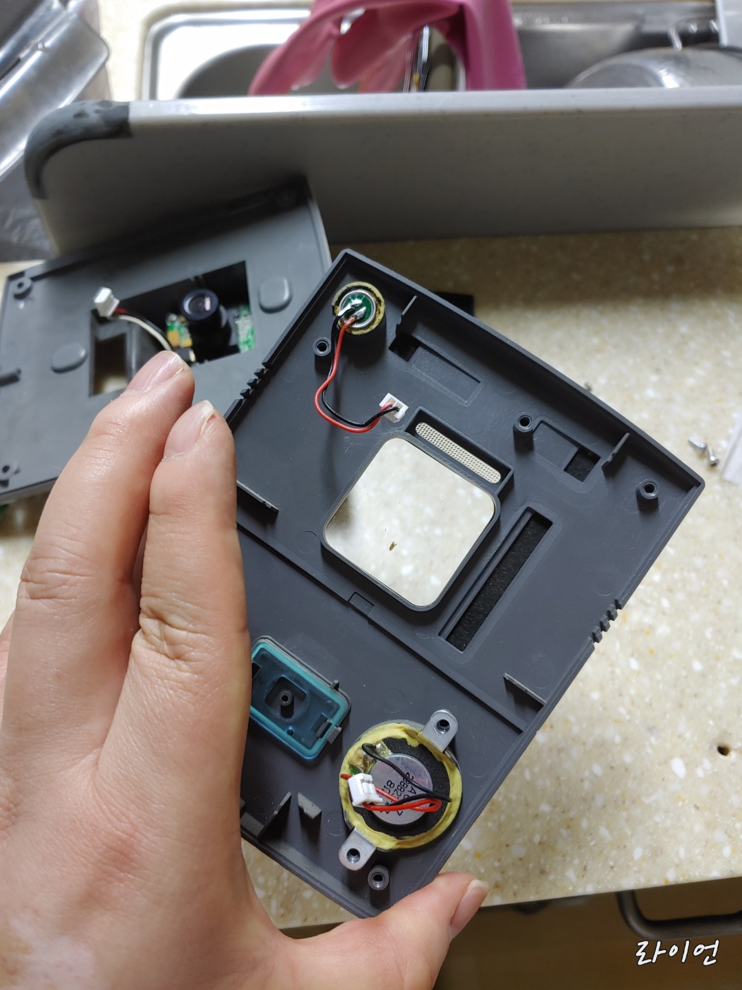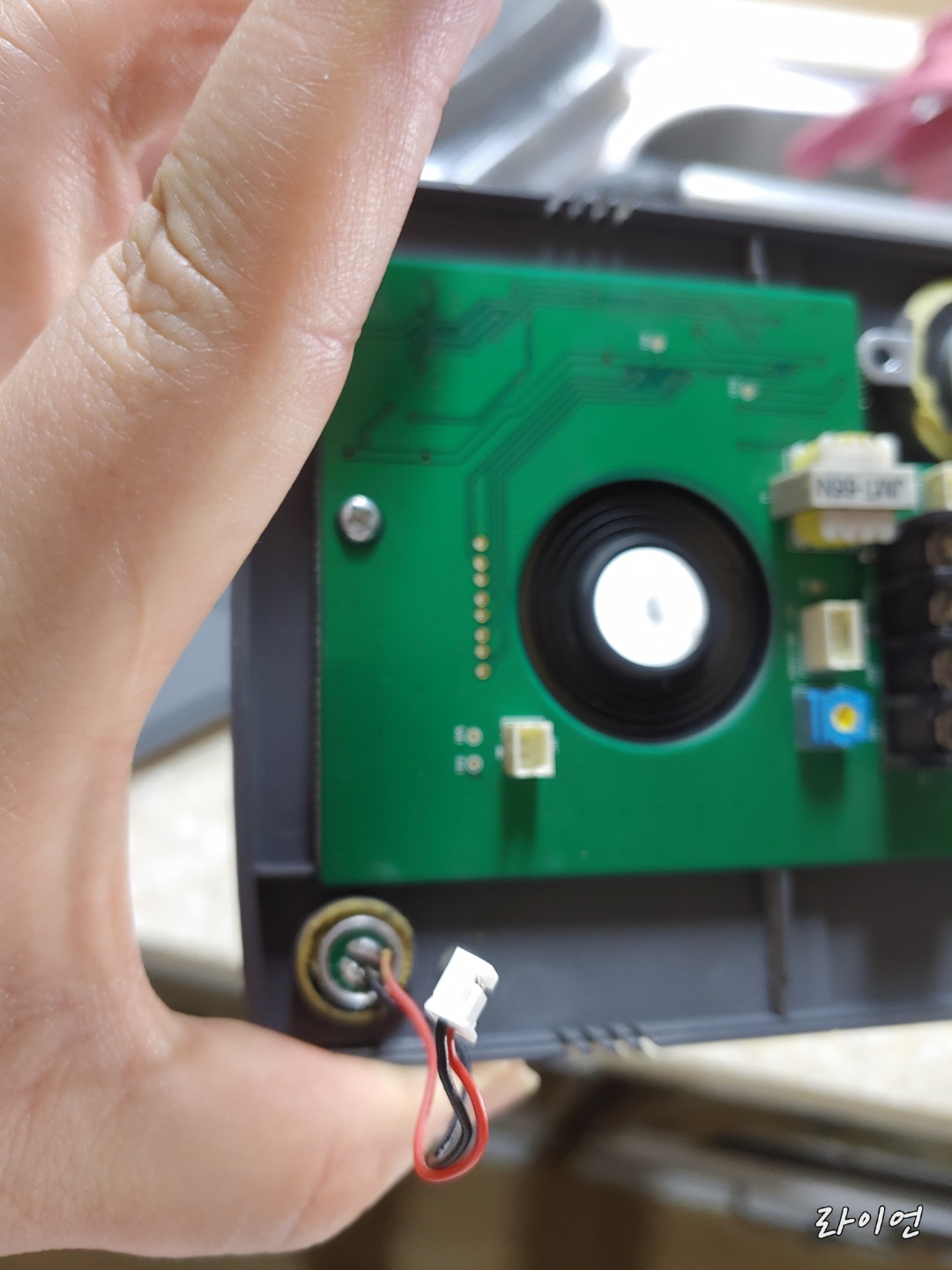 그담앤 기판에 마이크와 스피커 부분의 커넥터를 빼주고 + 볼트 2개 풀어주면 초인종 pcb기판만 딸랑 떨어집니다.