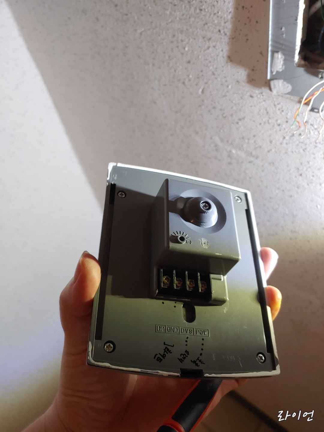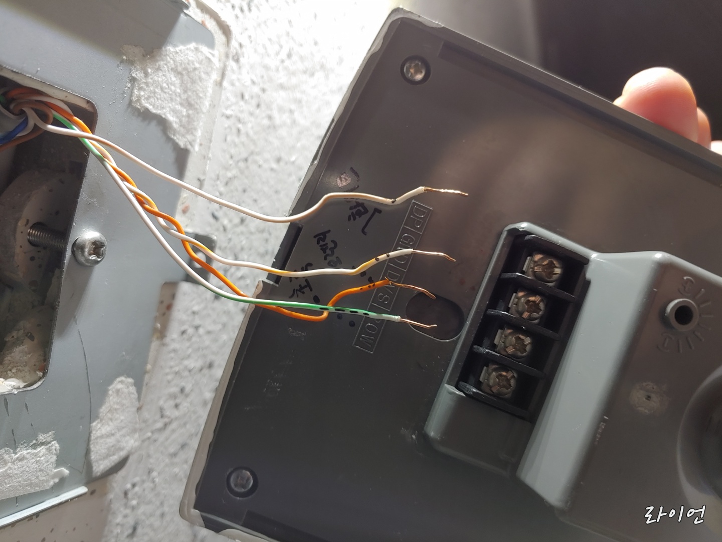 초인종 통신선 4가닥을 아까 표시해놓은 대로 연결을 완료 하고 벽에 붙어있는 철판 가이드에 위에서 아래로 내려서 조립을 하면 끝!