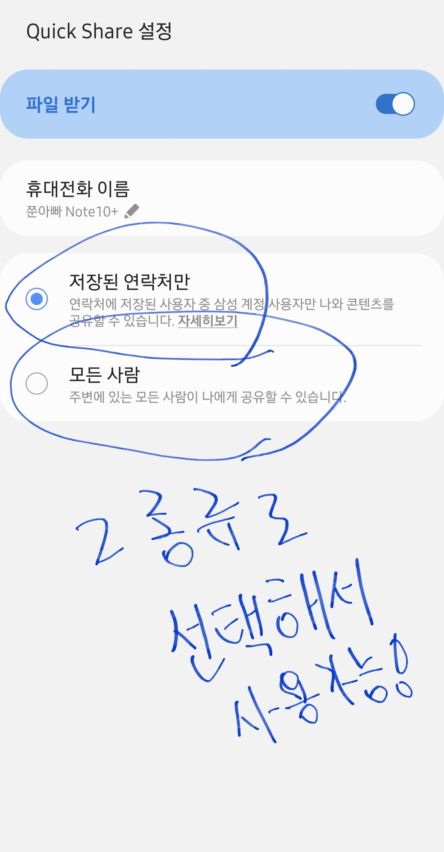 삼성스마트폰끼리 되며, one UI 2.1 업그레이드 된 최신 스마트폰만 가능하다는 점입니다.