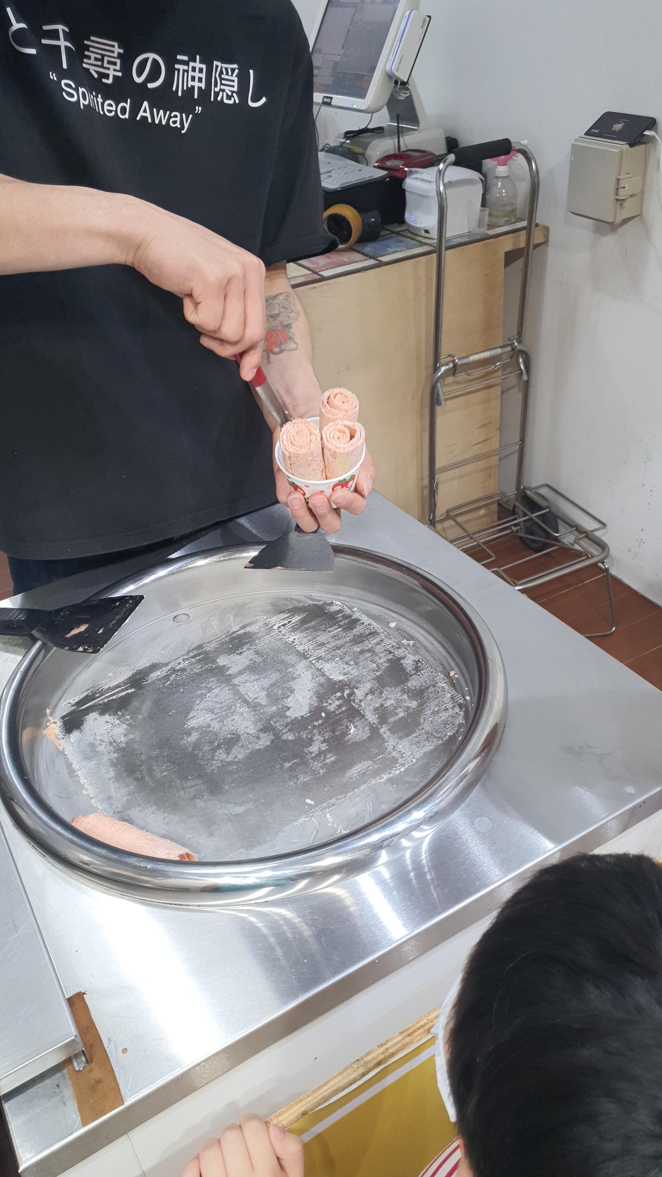 이제 철판 아이스크림이 만들어지고 있습니다.